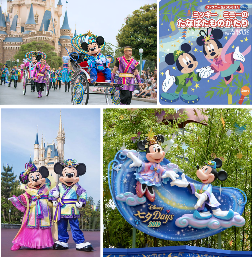 Tokyo Disneyland and Disney Sea sometimes celebrate the Tanabata Festival with a parade, with Minnie dressed as Orihime and Mickey as Hikoboshi.