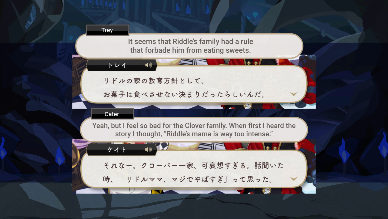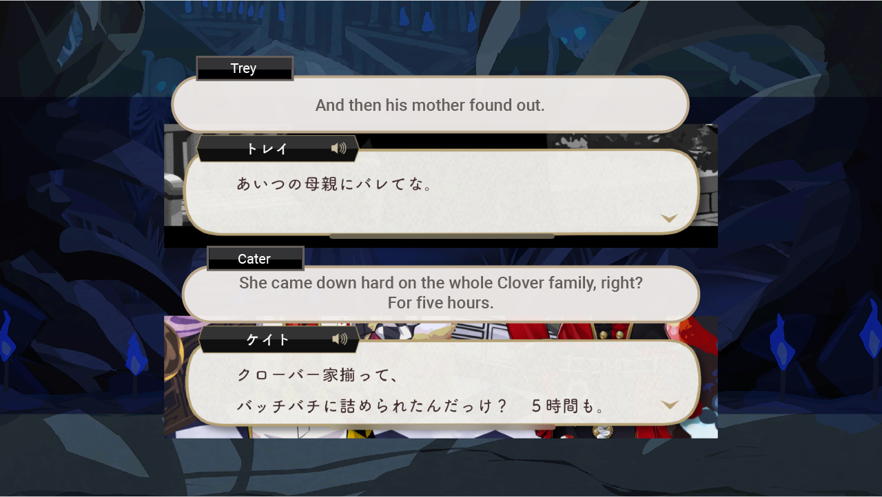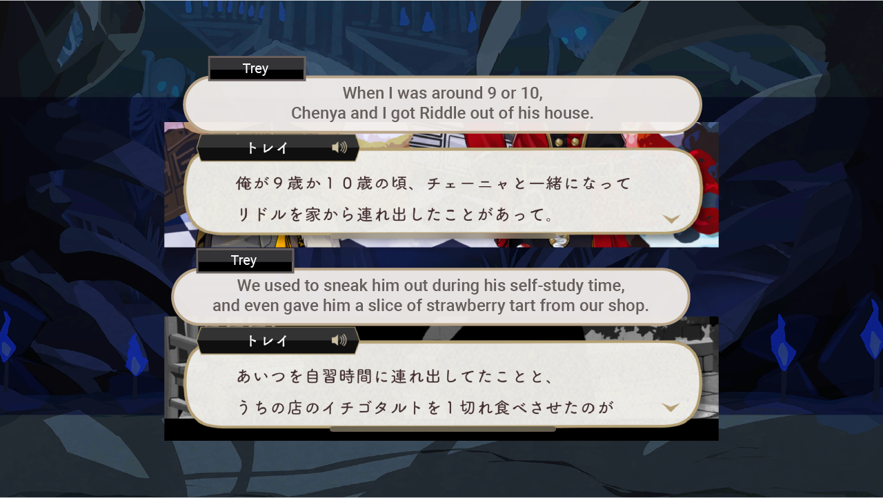 EN has since updated Trey’s dorm uniform vignette to reflect an accurate translation of his dialogue where it is Riddle’s mother who lectures his family, not his family lecturing him.
