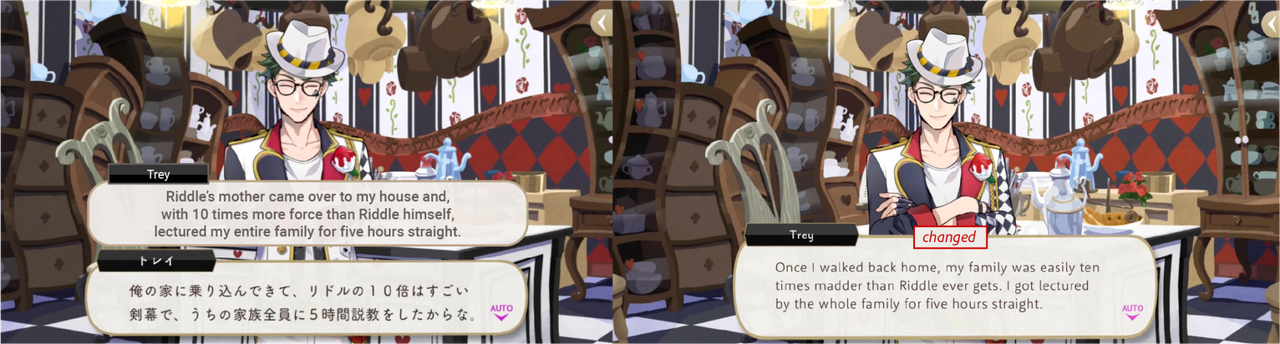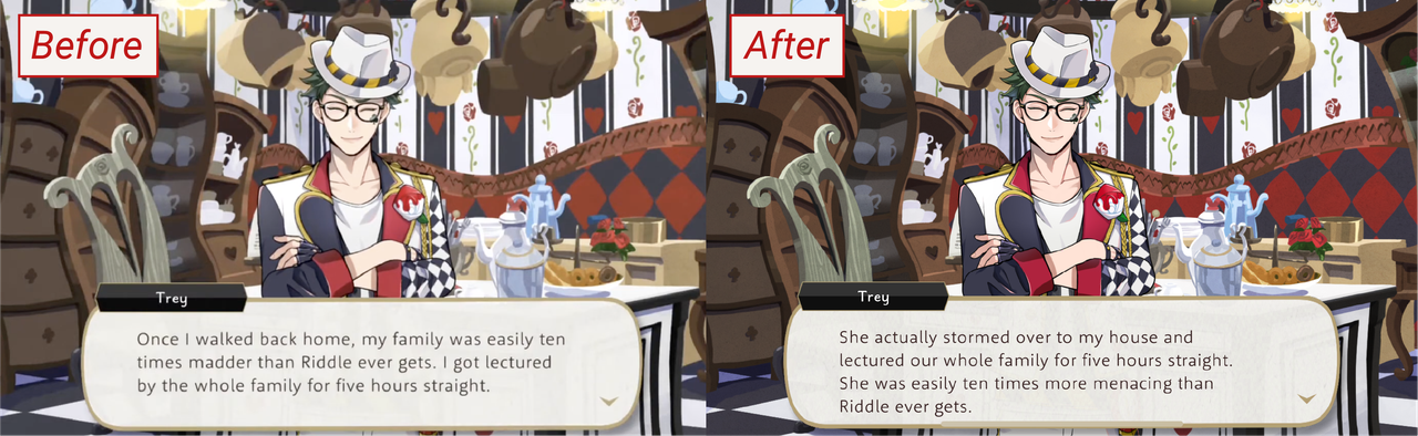 In Trey’s dorm vignette he originally explains that when Riddle’s mother discovered him at her house she lectured Trey’s entire family for five hours, in a scene that was faithfully recreated in the Heartslabyul manga. This history with Riddle was changed on EN to Trey getting lectured by his own family, instead.
