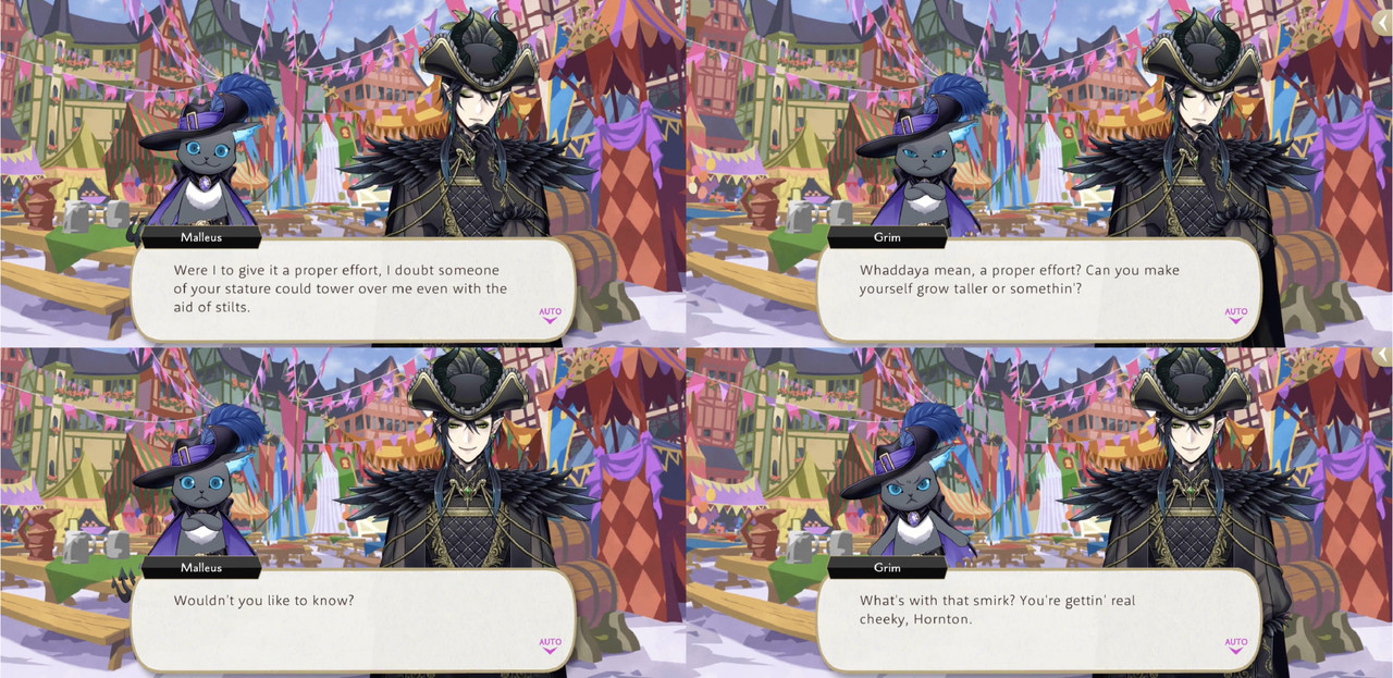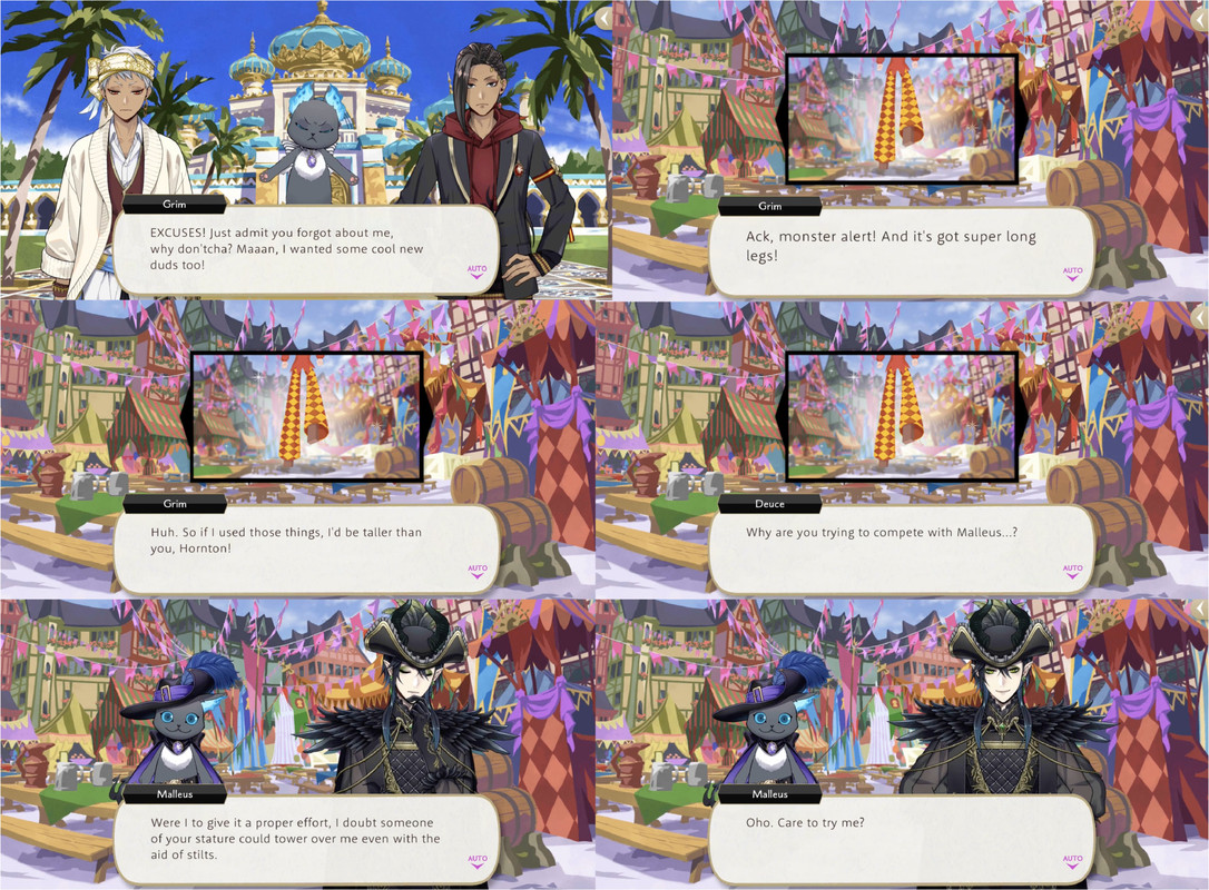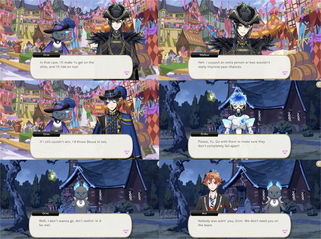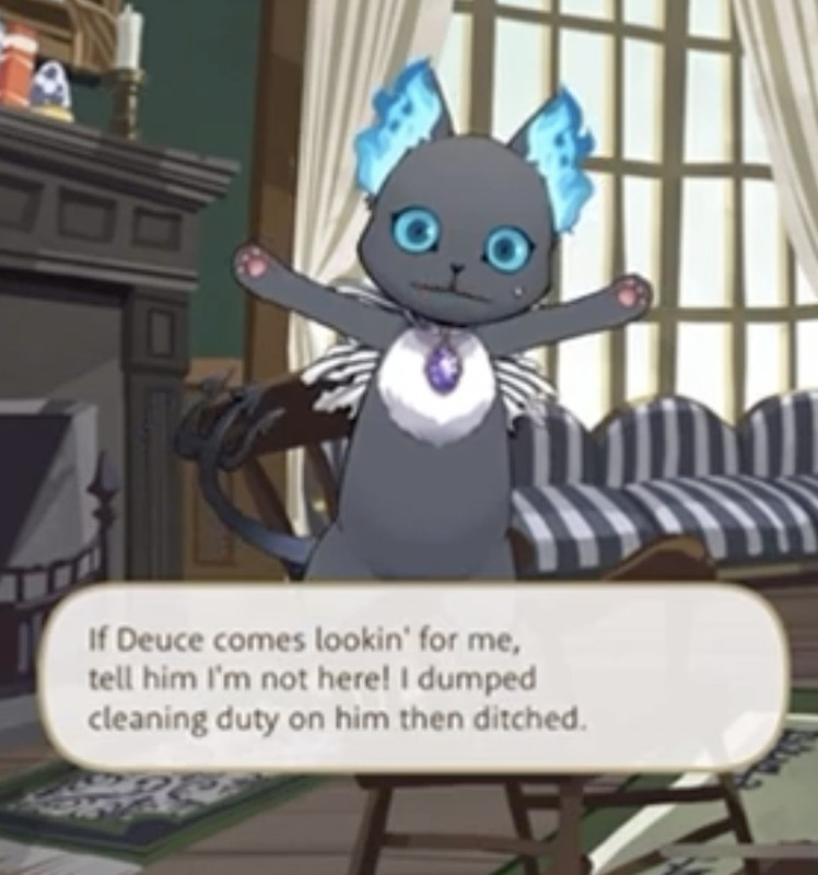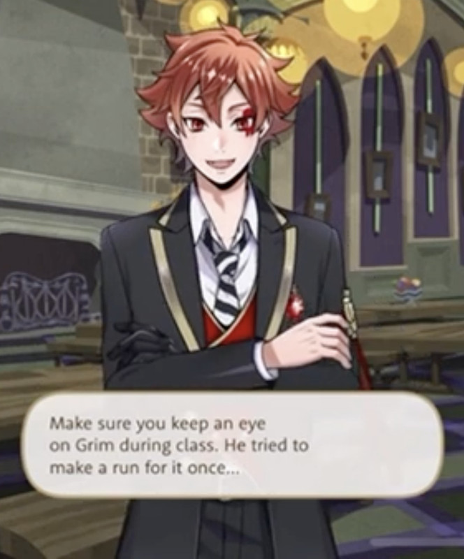 He is also envious of the clothes worn by the others in Firelit sky and he becomes determined to grow taller than Malleus during Glorious Masquerade, saying that he will get on stilts with the prefect and Deuce in order to overtake him.