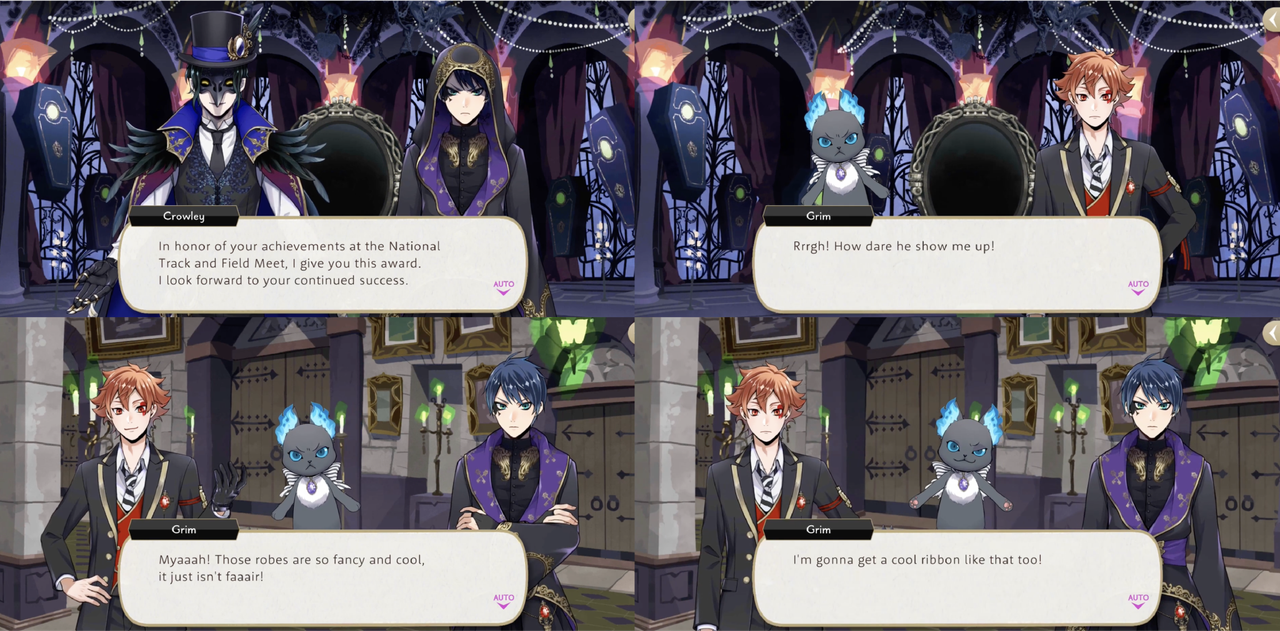 Grim will often become envious of others characters: when Deuce wins a track-and-field award Grim’s reaction is, “How dare he show me up!”.