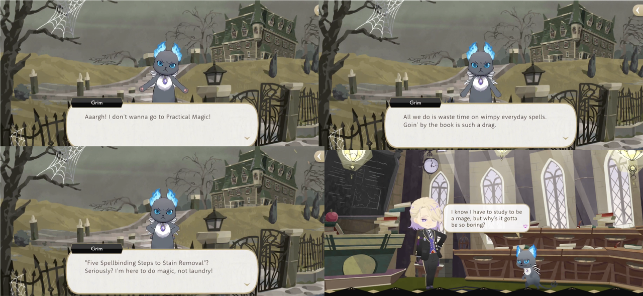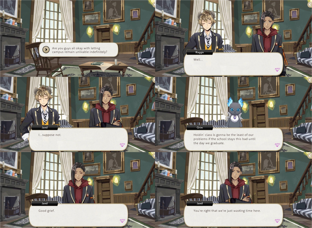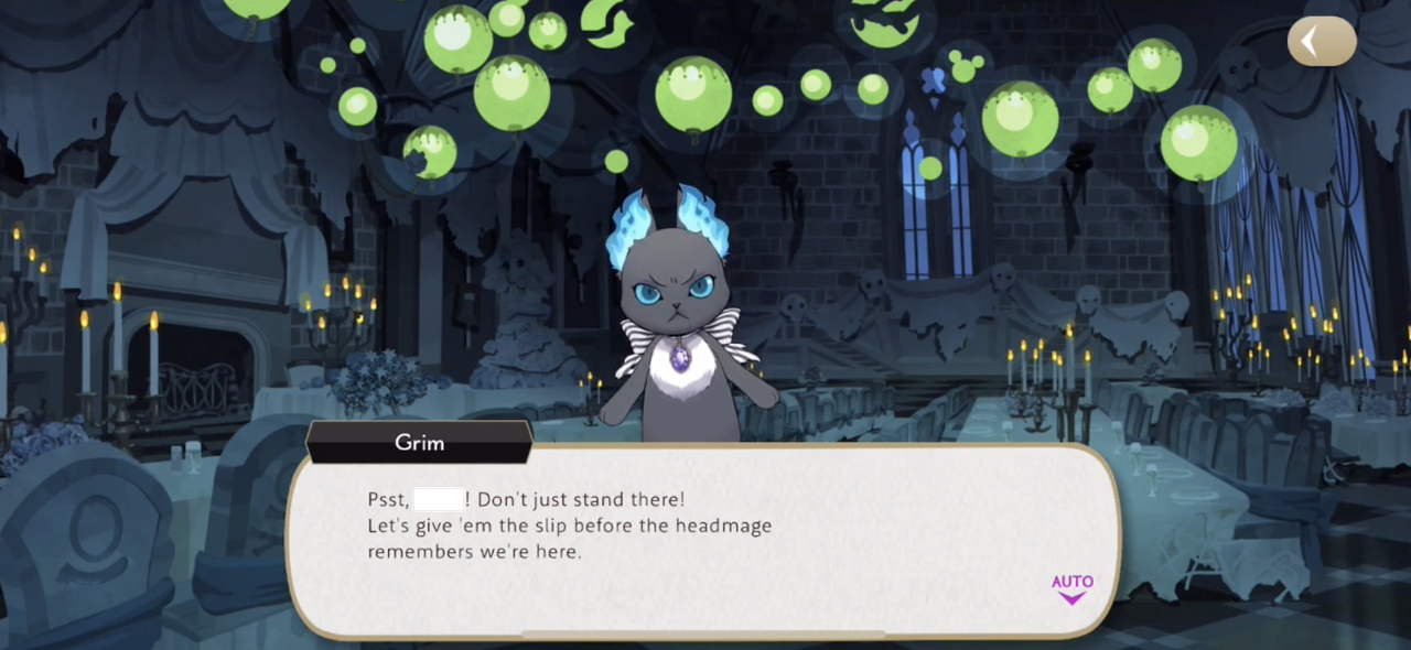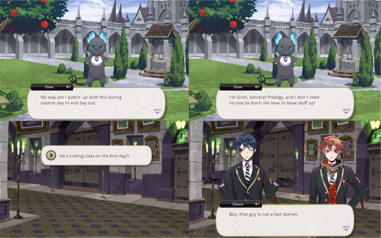Grim will occasionally make an astute observation about the situation at hand, pointing out the severity of their problems during Fairy Gala, convincing Ace and Deuce to cooperate during the Prologue and when Ace insults Deuce one time too often (causing Deuce to leave their VDC rehearsal so as to not have to put up with him) Grim observes, “You really gotta start thinkin’ about other people’s feelings before you open your mouth.”