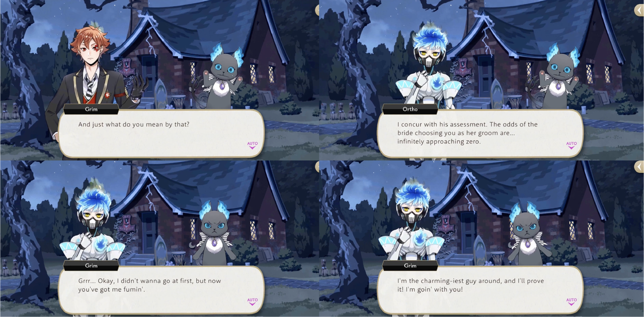 Grim refuses to participate in the Phantom Bride event until Ace tells him that he isn’t needed, at which point he decides he is going with the group in order to prove how charming he is.
