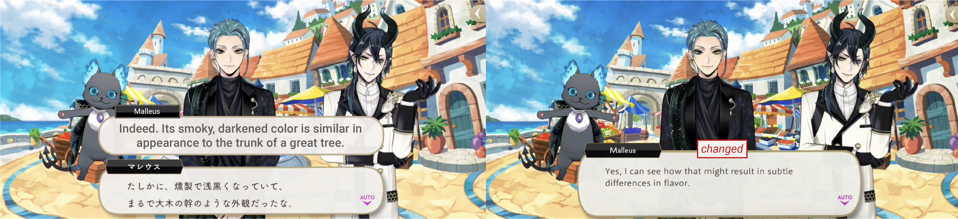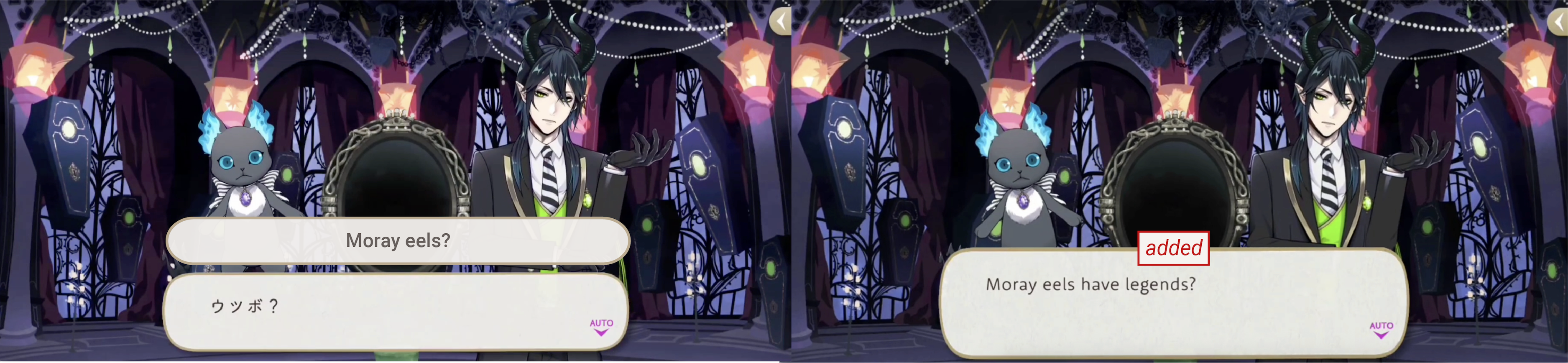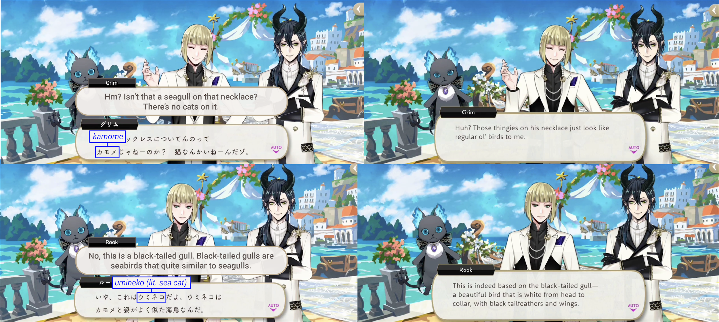 “Black-tailed gull” is umineko, which is literally “sea cat,” confusing Grim and leading to small dialogue adjustments on EN: