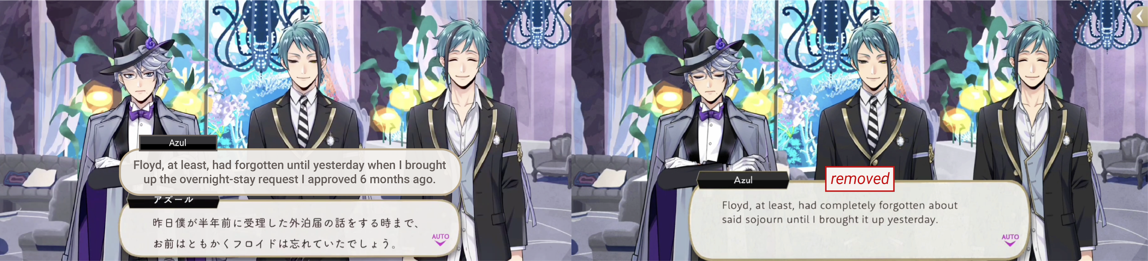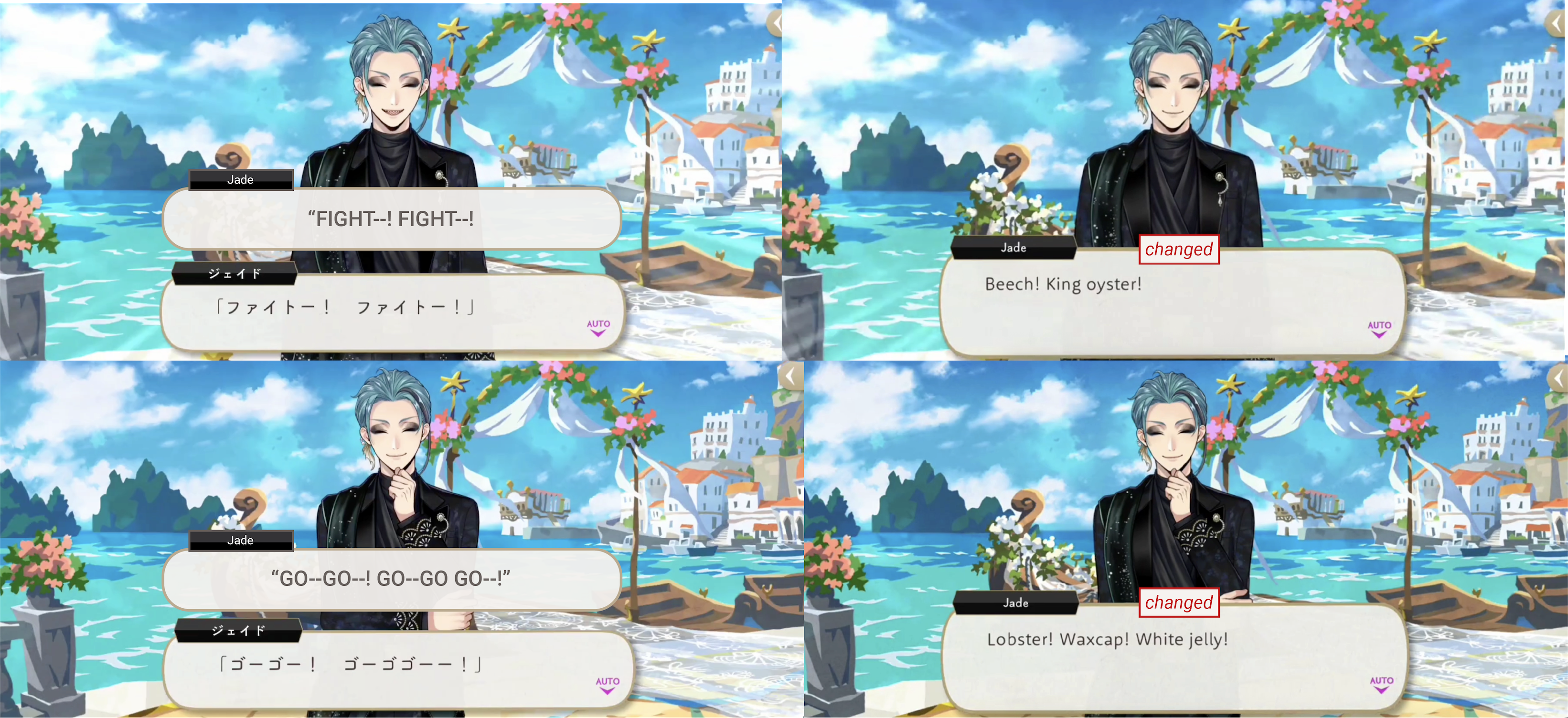 Originally Jade tells Riddle and Malleus to yell out FIGHT, FIGHT and GO GO! GO GOGO! as they row, changed on EN to the names of mushrooms: “Beech! King oyster! Lobster! Waxcap! White jelly!
