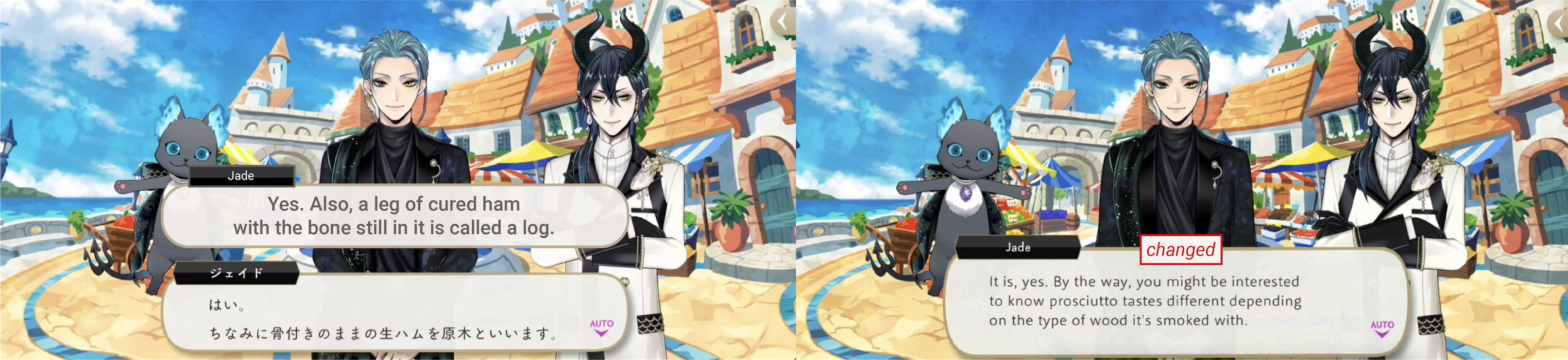 In the context of prosciutto, a leg of cured ham with a bone is referred to as a “log” in Japanese. Jade mentions this to Malleus in an interaction that had to be adjusted for EN: