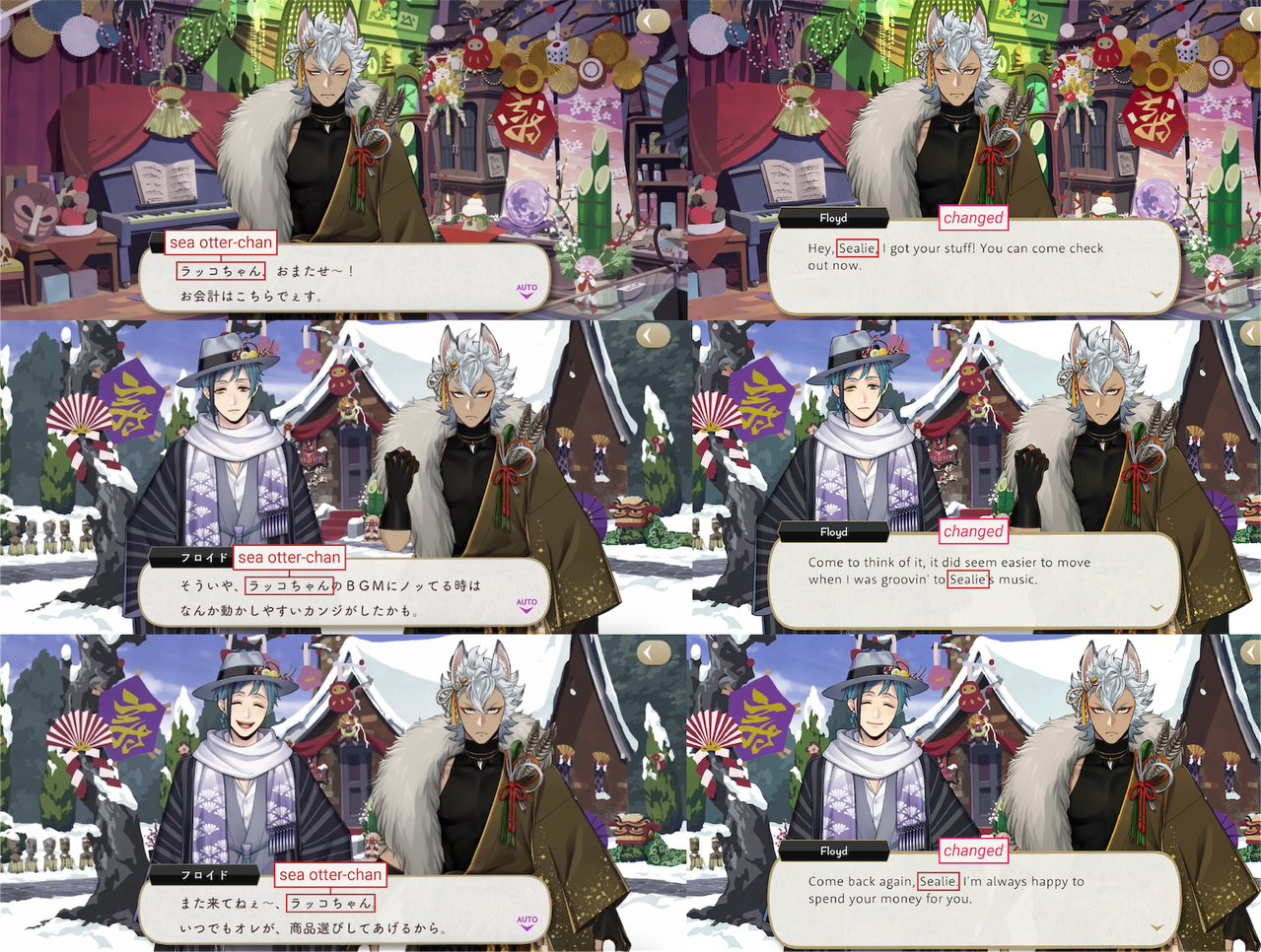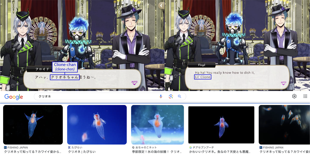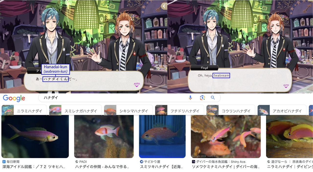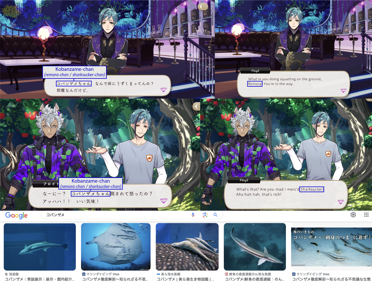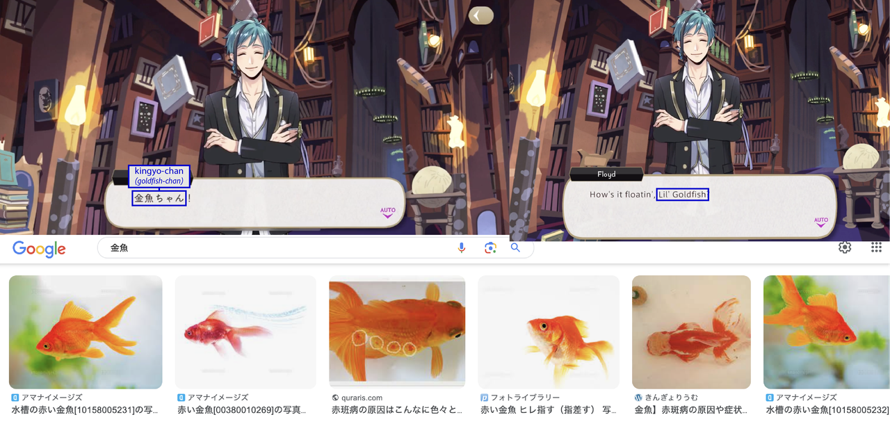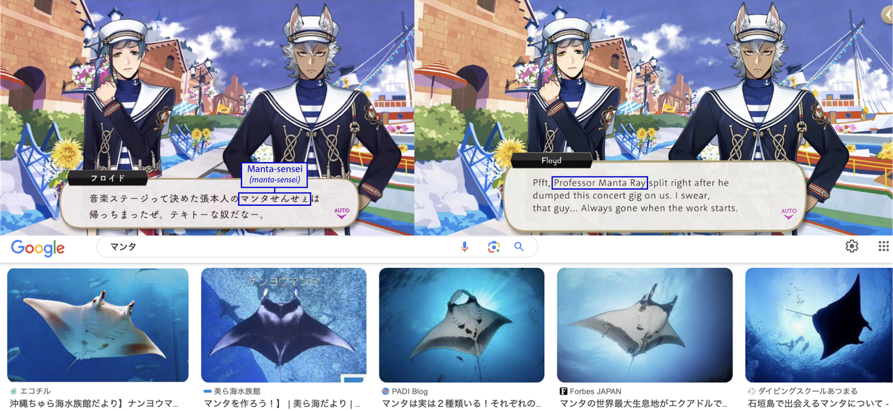 (Floyd’s nickname for Ruggie remains the same in the original game, but on EN it is “remora” in one place and “sharksucker” in others, which seem to be two names for the same fish.)