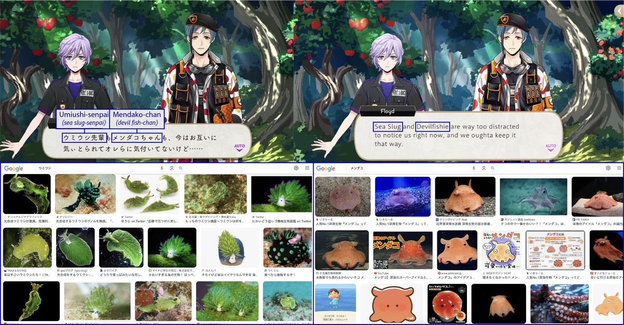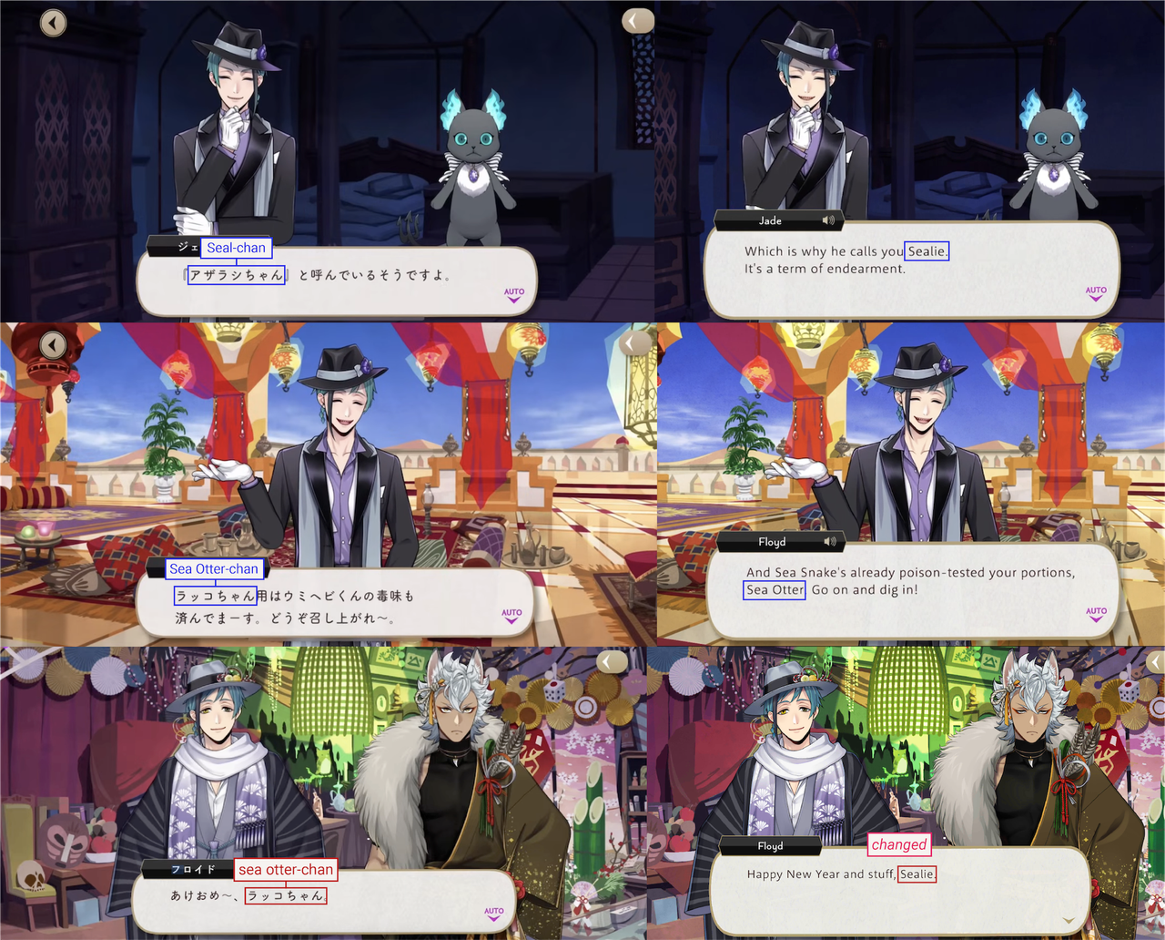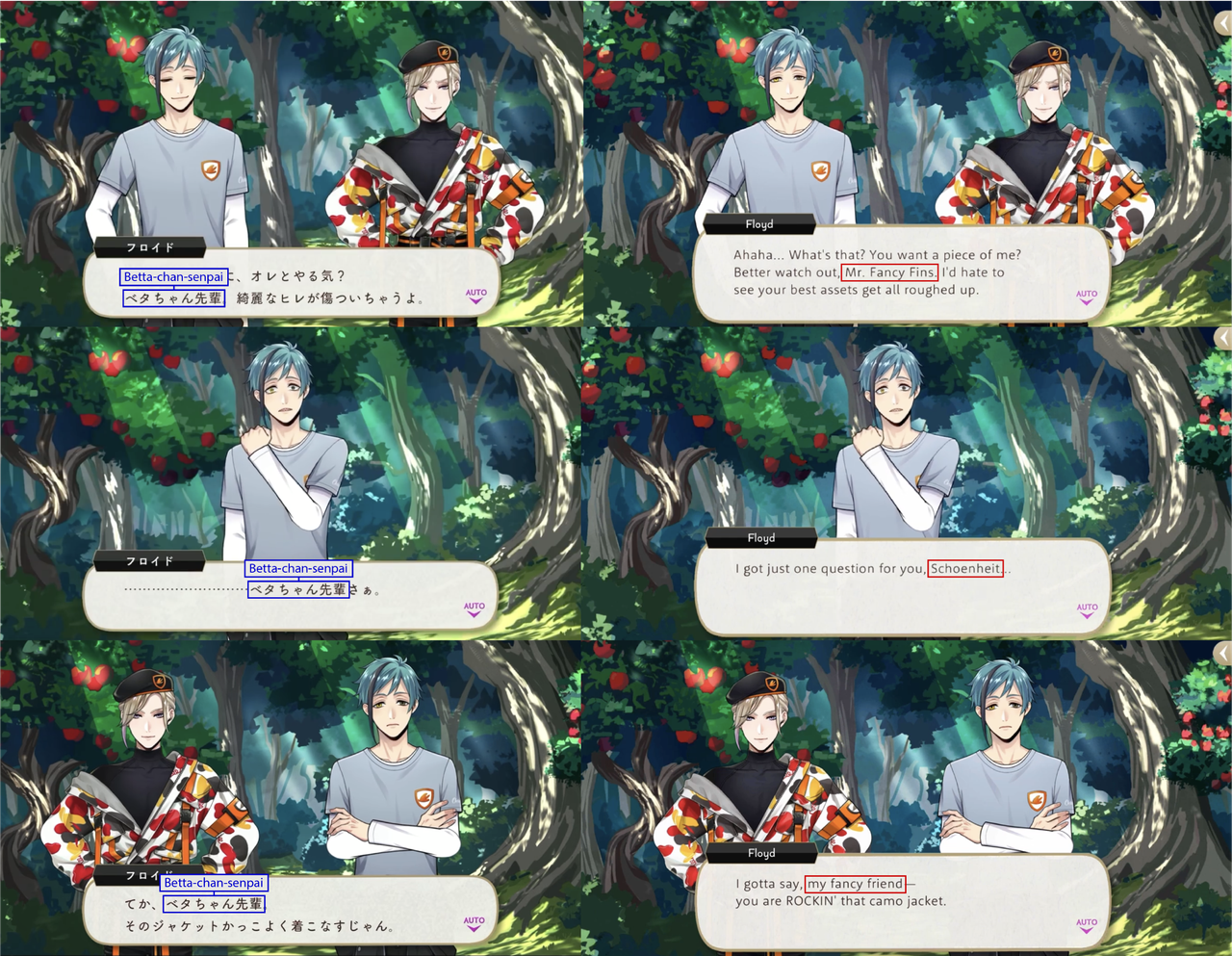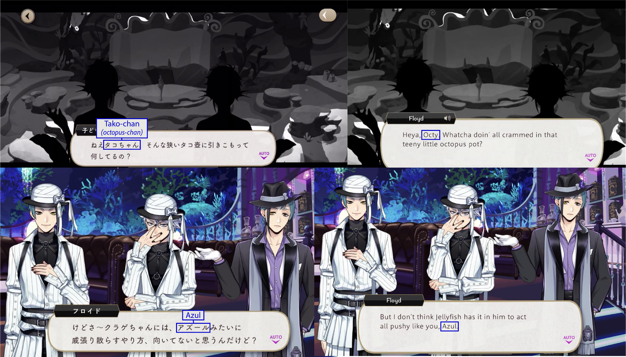 Unlike Rook (who shifts between using French/Japanese/English with his nicknames and sometimes drops them completely), Floyd is strict about his names: he never uses any name with anyone besides the sea-creature name he decides for them, except for Azul and Jade. The game emphasizes this with Floyd’s “Azul’s Azul” line, so it is interesting that EN’s continuity for Floyd is so flexible.