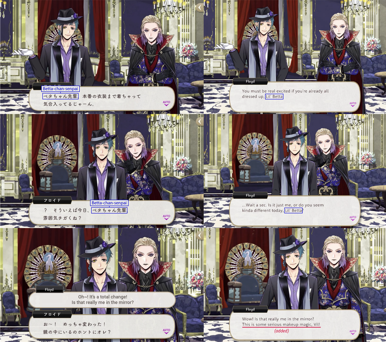 Questions have been received before about whether or not Vil and Floyd have a unique relationship of some kind since—besides Azul and Jade—Vil is the only character Floyd refers to by names outside of his own sea-life-naming-convention, but he doesn’t. The EN-server exclusive changes to his dialogue that diverge from Betta-chan-senpai are non-canon.