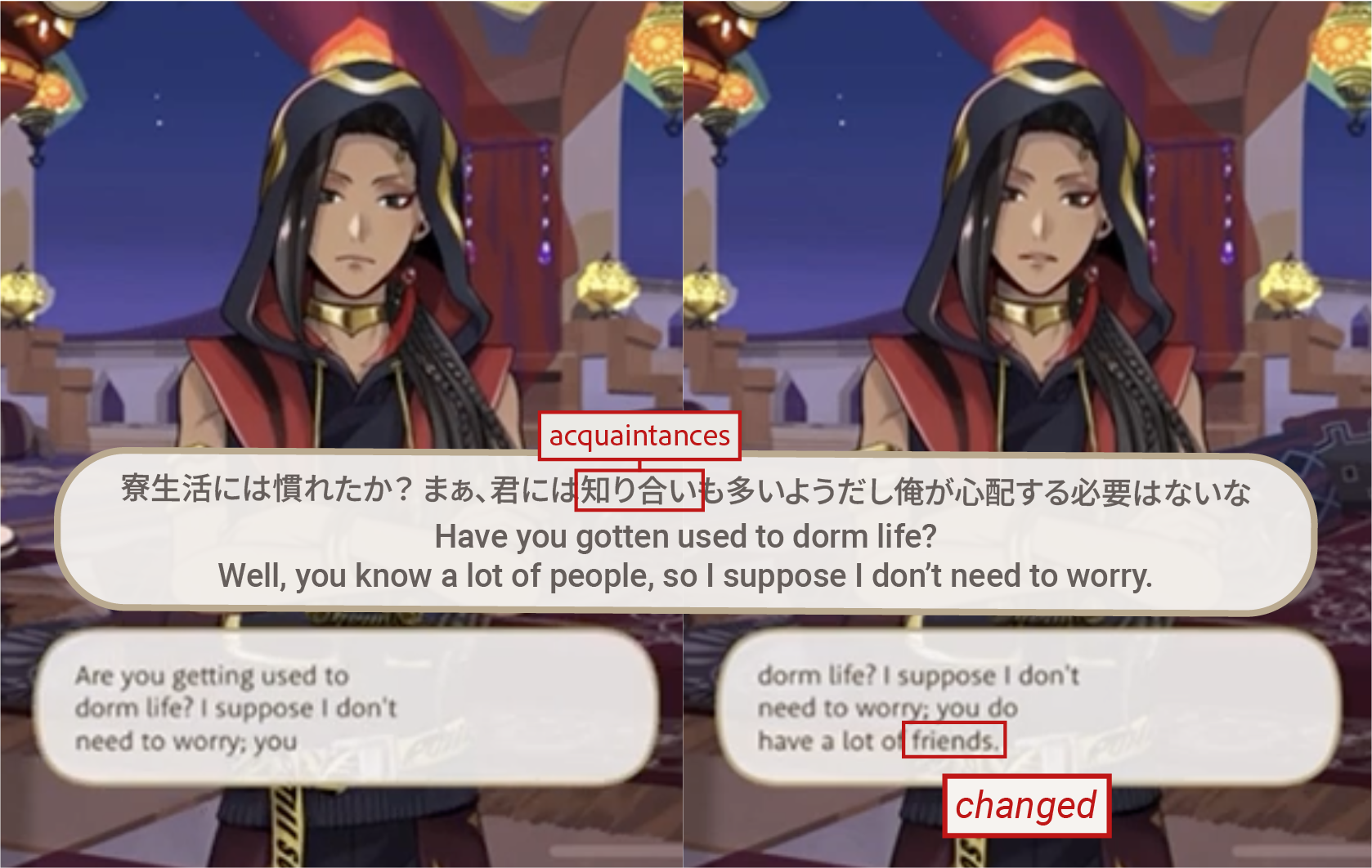 ・This information comes from the original game and not the EN-adaptation, where the word friend will sometimes be added to dialogue.