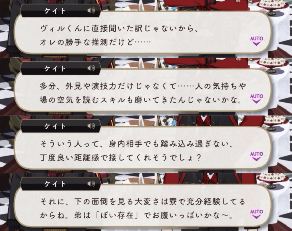 During a vignette Cater says that he would like Vil to be his older brother, as Vil is independent, does things properly and might give him fashion tips or allow him to visit during photo shoots.