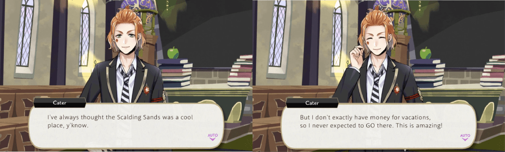 Cater trying to convince Vil to let him upload a picture of Vil to Cater’s own Magicam is a theme throughout most of their interactions. Vil is unimpressed by Cater’s flatter (“I’d prefer you to keep that mouth shut if you have nothing genuine to say”) and refuses Cater’s constant requests for permission to share his photo.