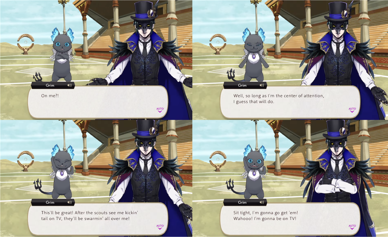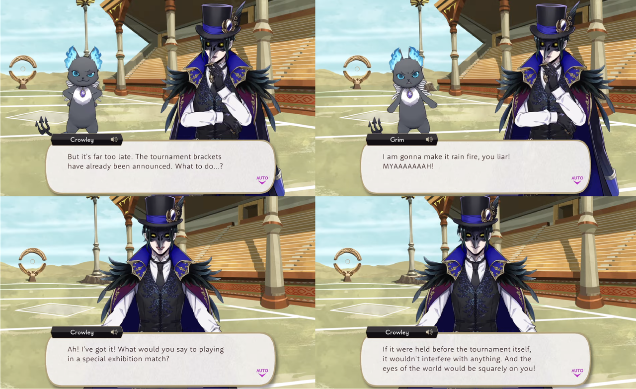 Crowley does not fulfill his promise, instead arranging for Grim to participate in an exhibition match before the tournament itself. (Grim: “Well, so long as I’m the center of attention, I guess that will do.”)