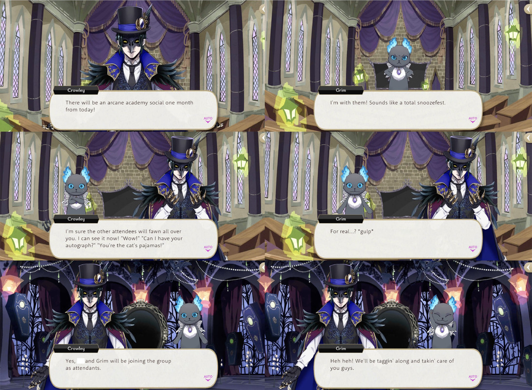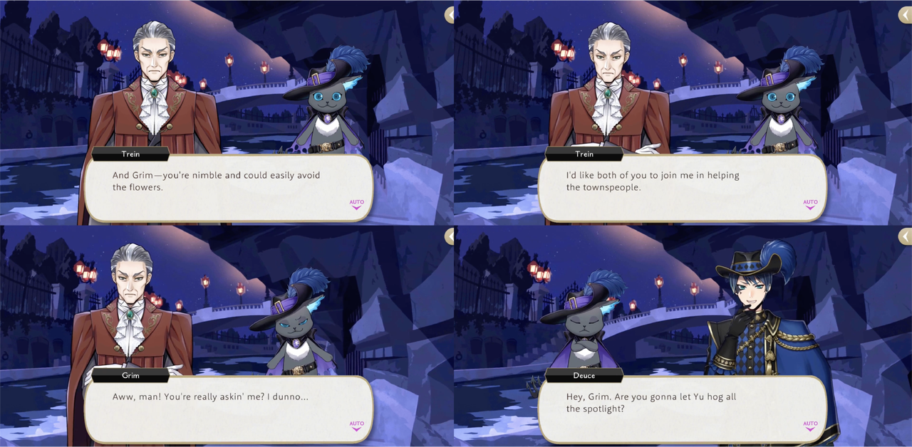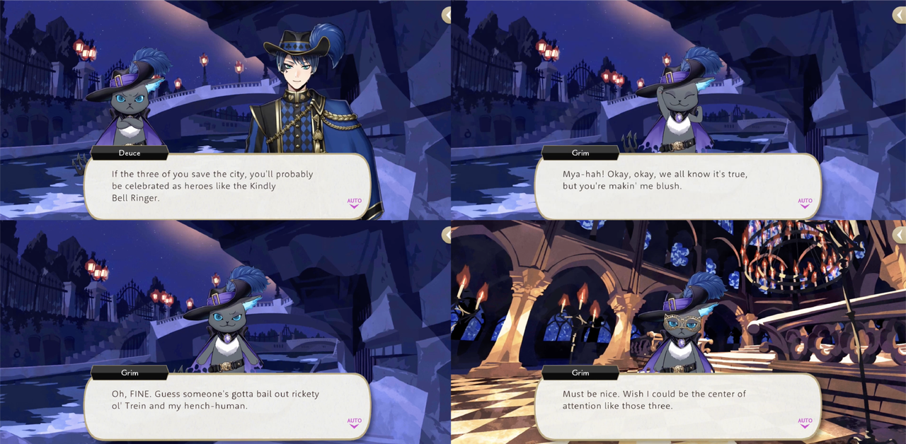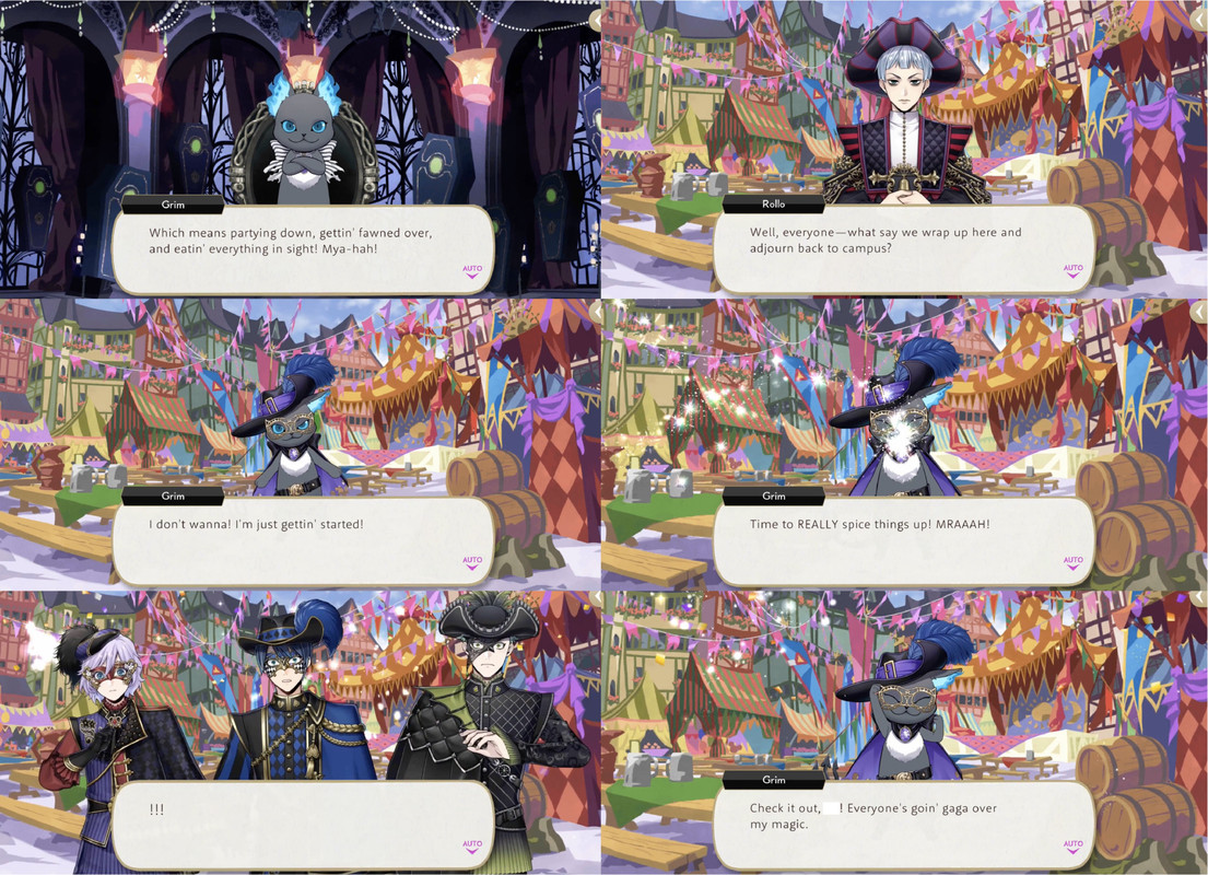 The event ends with a performance lead by Malleus, Azul and Idia, to which Grim reacts, “Wish I could be the center of attention like those three.”
