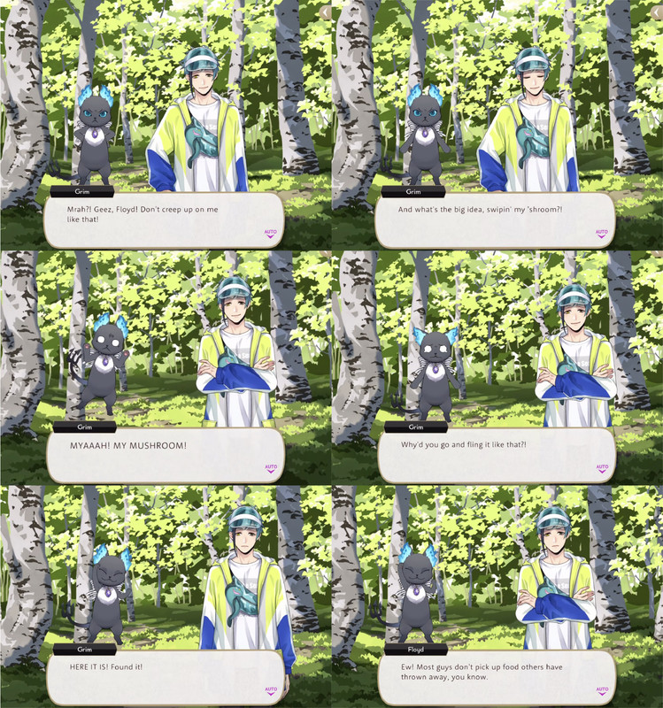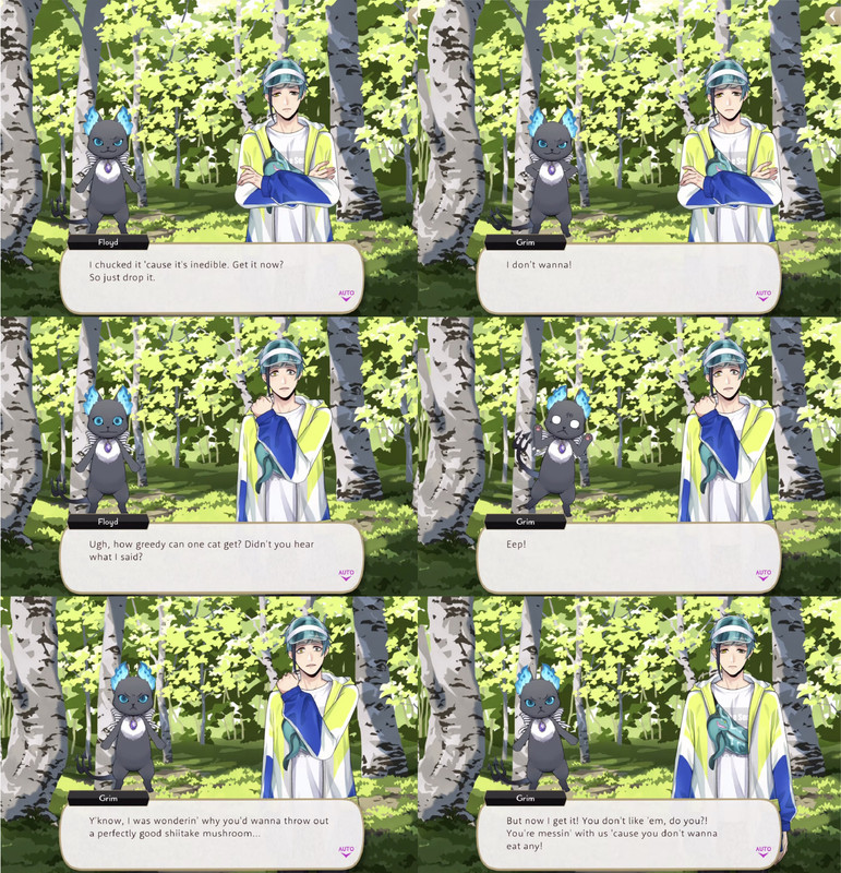 Grim and Floyd overlap in a vignette where Grim accuses Floyd of throwing out a mushroom he found simply because he doesn’t like mushrooms. Grim picks up the mushroom from where it hit the ground and runs away with it, ignoring Floyd’s protests.