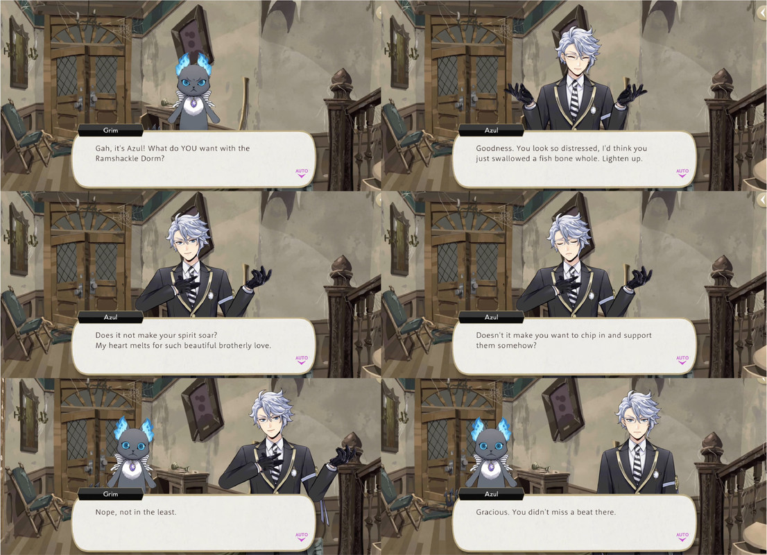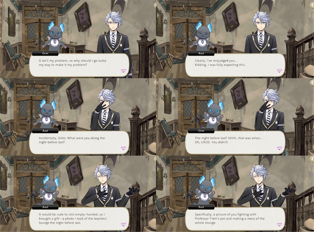 Grim reacts with, “It ain’t my problem, so why should I go outta my way to make it my problem?” and Azul responds, “I was fully expecting this,” procuring a photo of Grim fighting with Lucius and making a mess of the teacher’s lounge (Grim blames Lucius for stealing his snack).