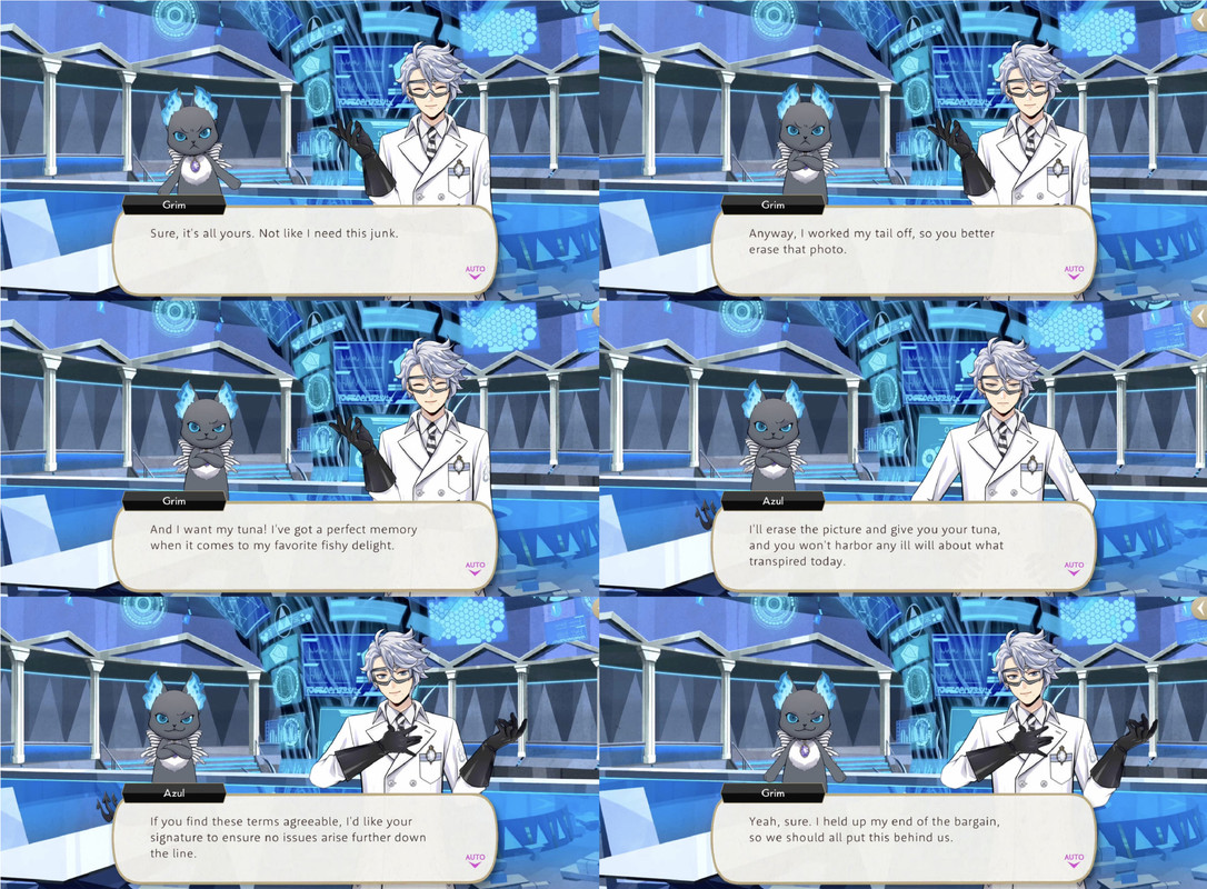 Grim changes his mind when Azul’s request is revealed to be dangerous (“You’d…get a blast of high-power technomantic energy to the face” – Idia), but he acquiesces when Azul adds a can of tuna to their deal.