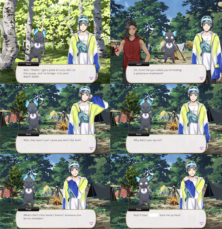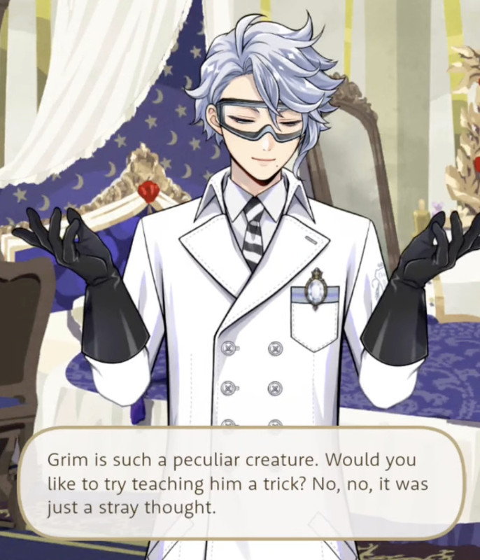 Floyd’s response to meeting Grim for the first time is wanting to “squeeze” him, which is a threat that Grim seems intimidated by. Grim says that he is always worried about the twins “schemin’ something” every time he sees them, and is not fond of Floyd’s nickname for him, saying that it makes him feel like he’s being insulted. (Floyd calls him Seal because he is round.)
