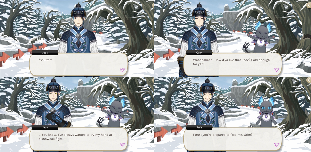 Grim instigates a snowball fight with Jade during Harveston, but he seems to have some lingering fear of the twins held over from Book 3, saying, “Just lookin’ at their faces makes me think back to when they were workin’ me like a dog.”