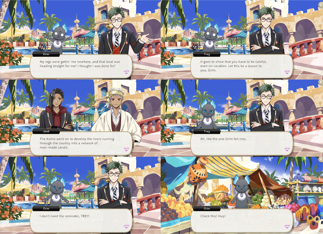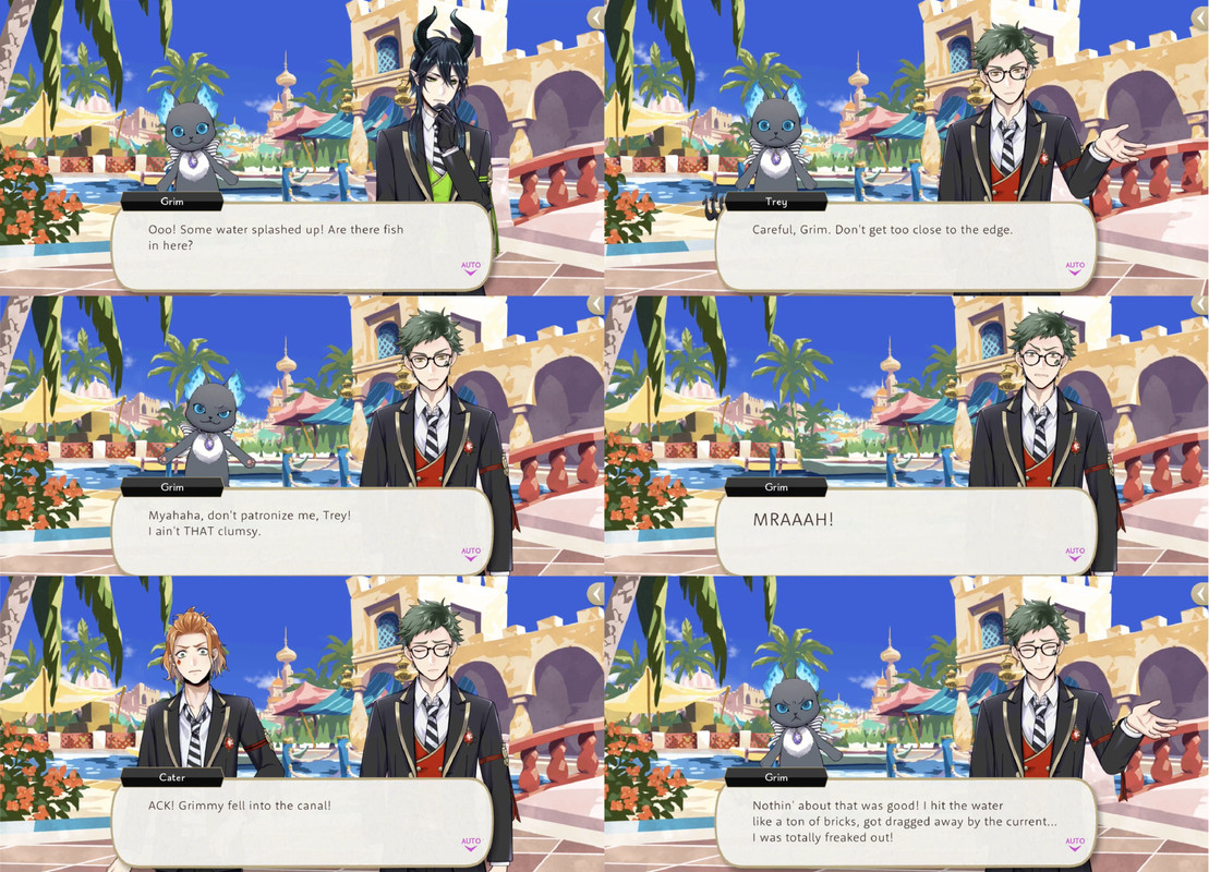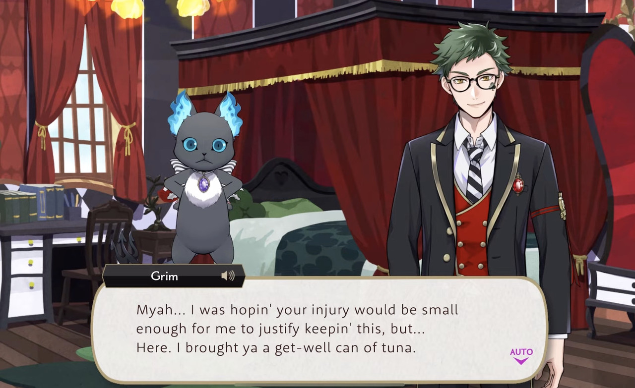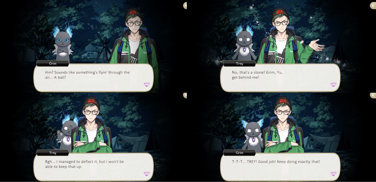 Trey has a line about getting a toy (presumably for cats) to help Grim keep his teeth clean, and he feeds both Grim and the prefect during Vargas Camp.