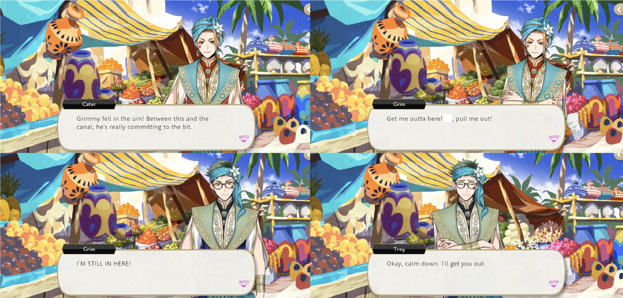 Trey helps look out for Grim during the Firelit Sky event, cautioning him about falling into a canal (which Grim then does) and scolding him afterwards.