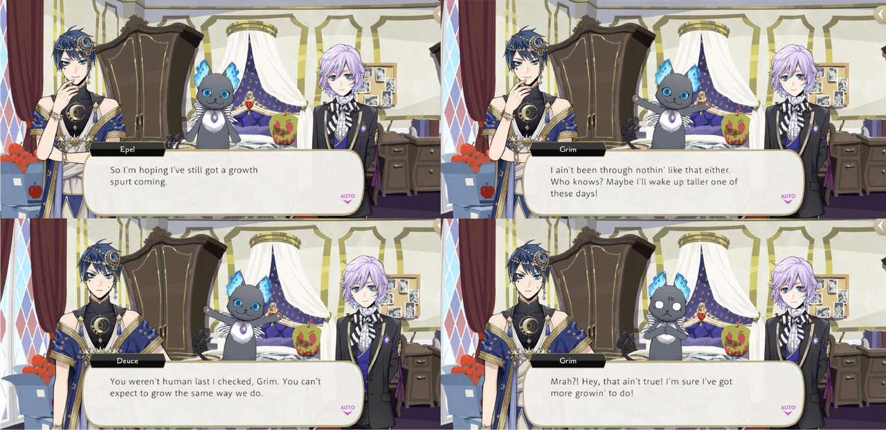 Deuce says that Grim can’t expect to grow the same way they do as he is not human and Grim insists, “I’m sure I’ve got more growin’ to do! Just you wait, Deuce! I’ll be towering over you one day! I’ll do whatever it takes!” Epel responds, “I hope you can grow bigger too, Grim.”