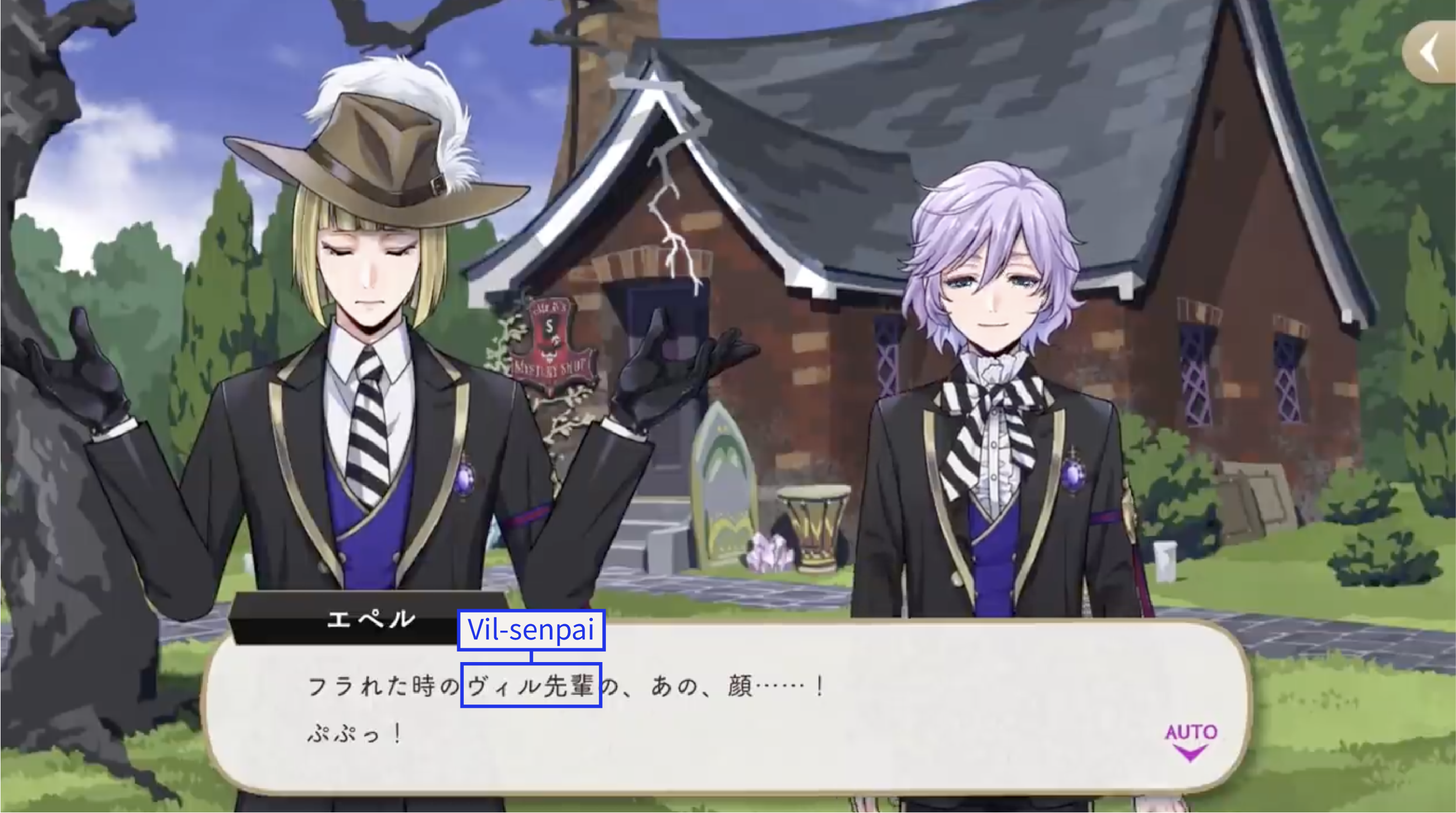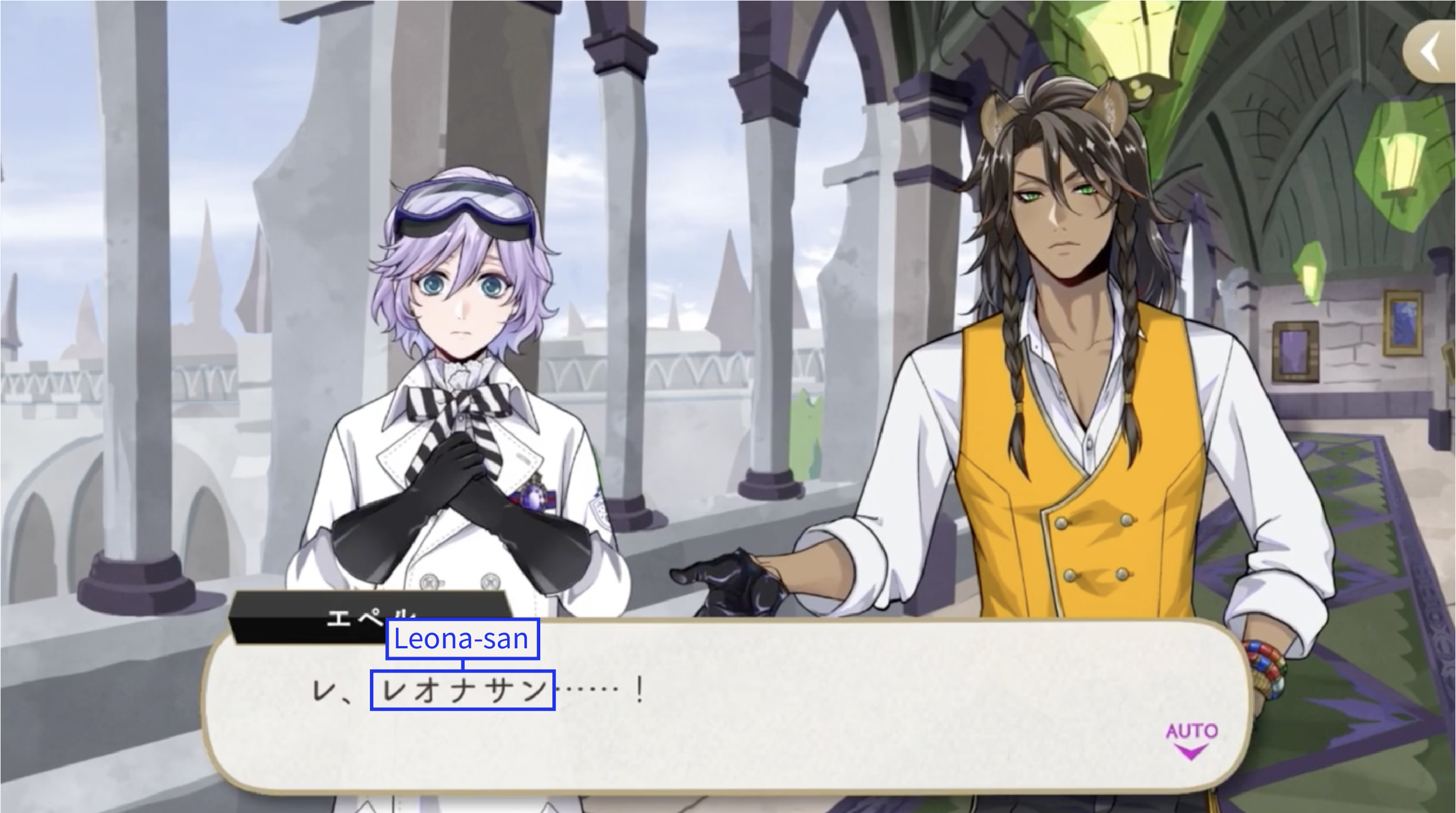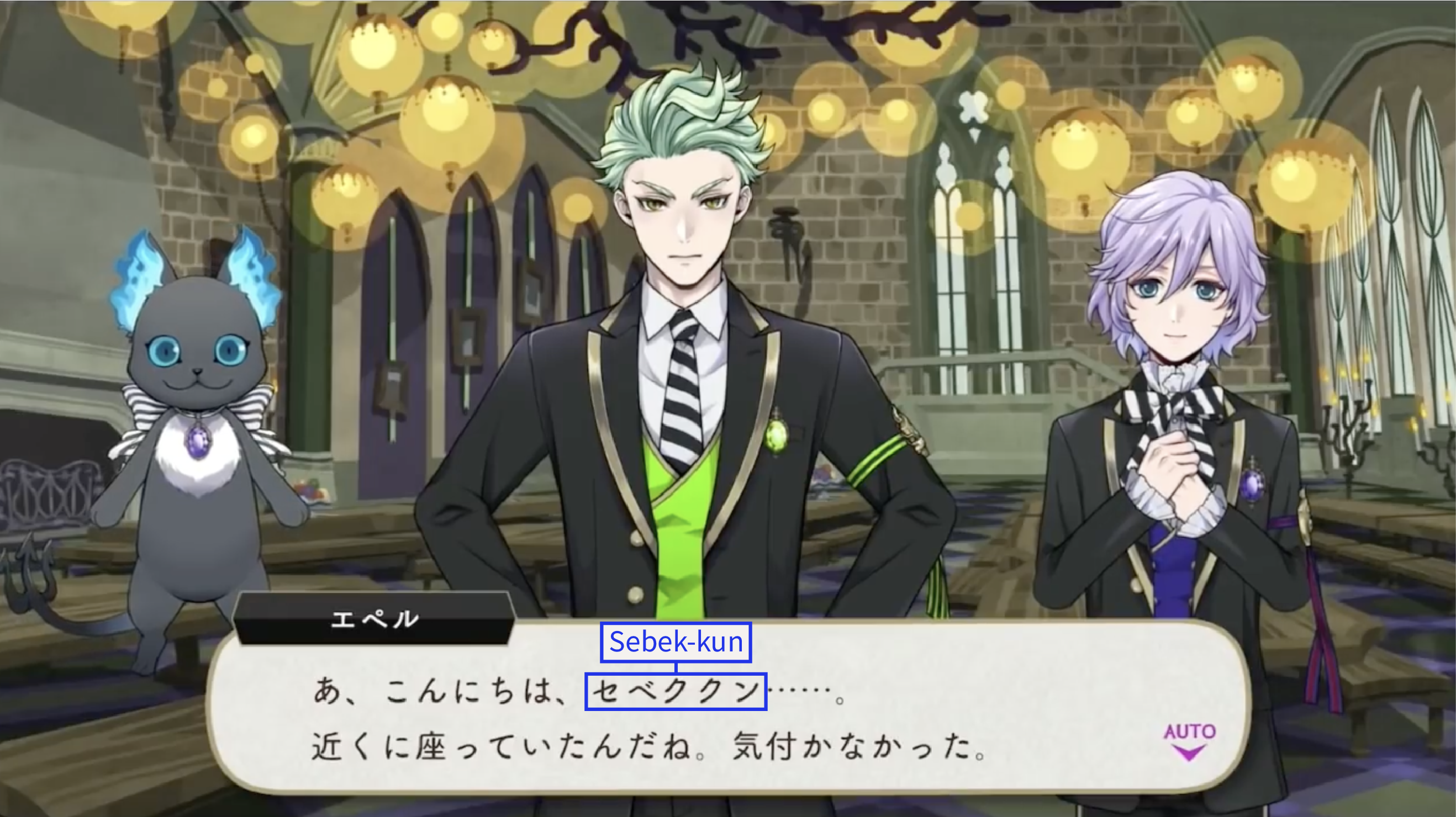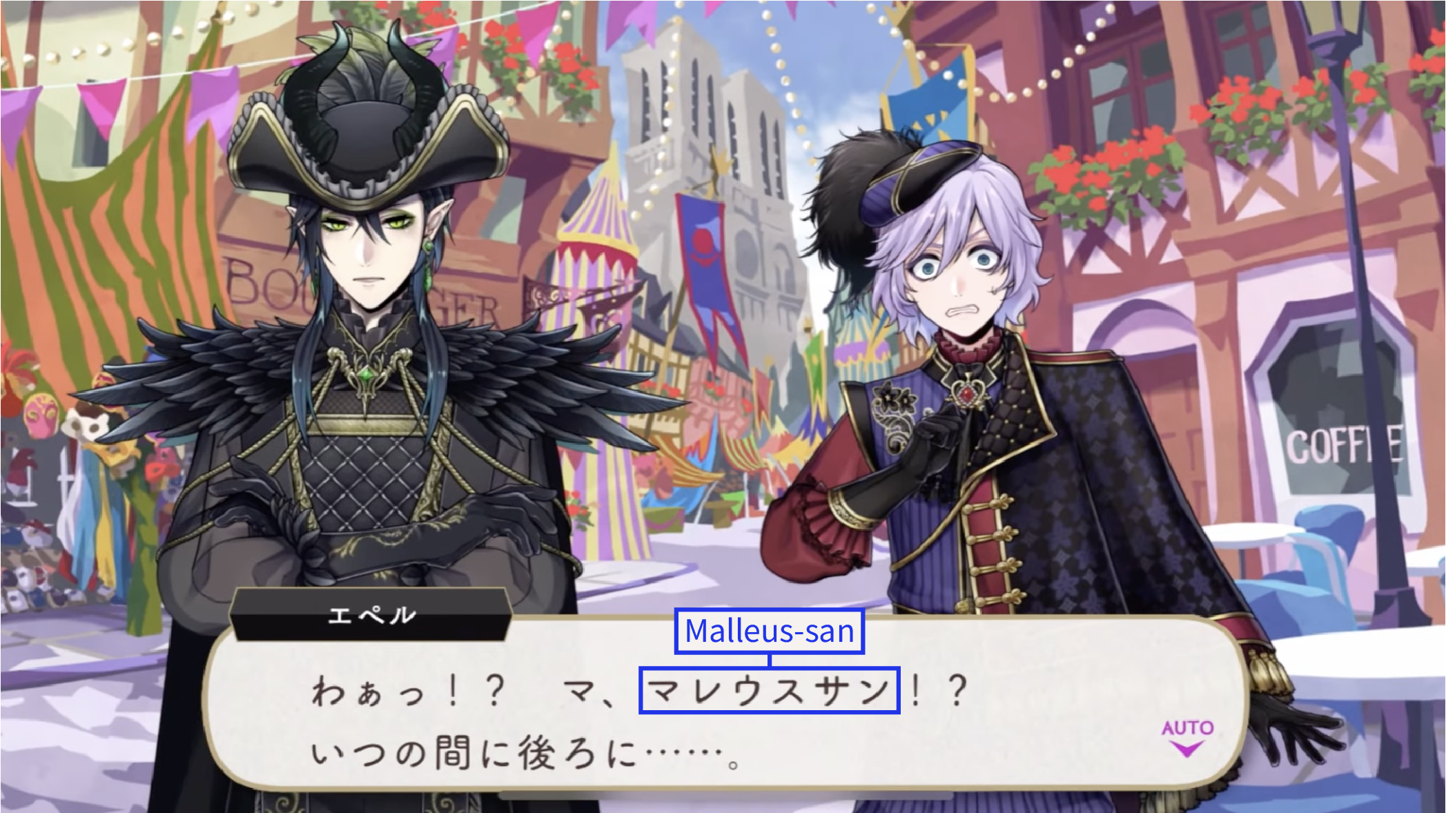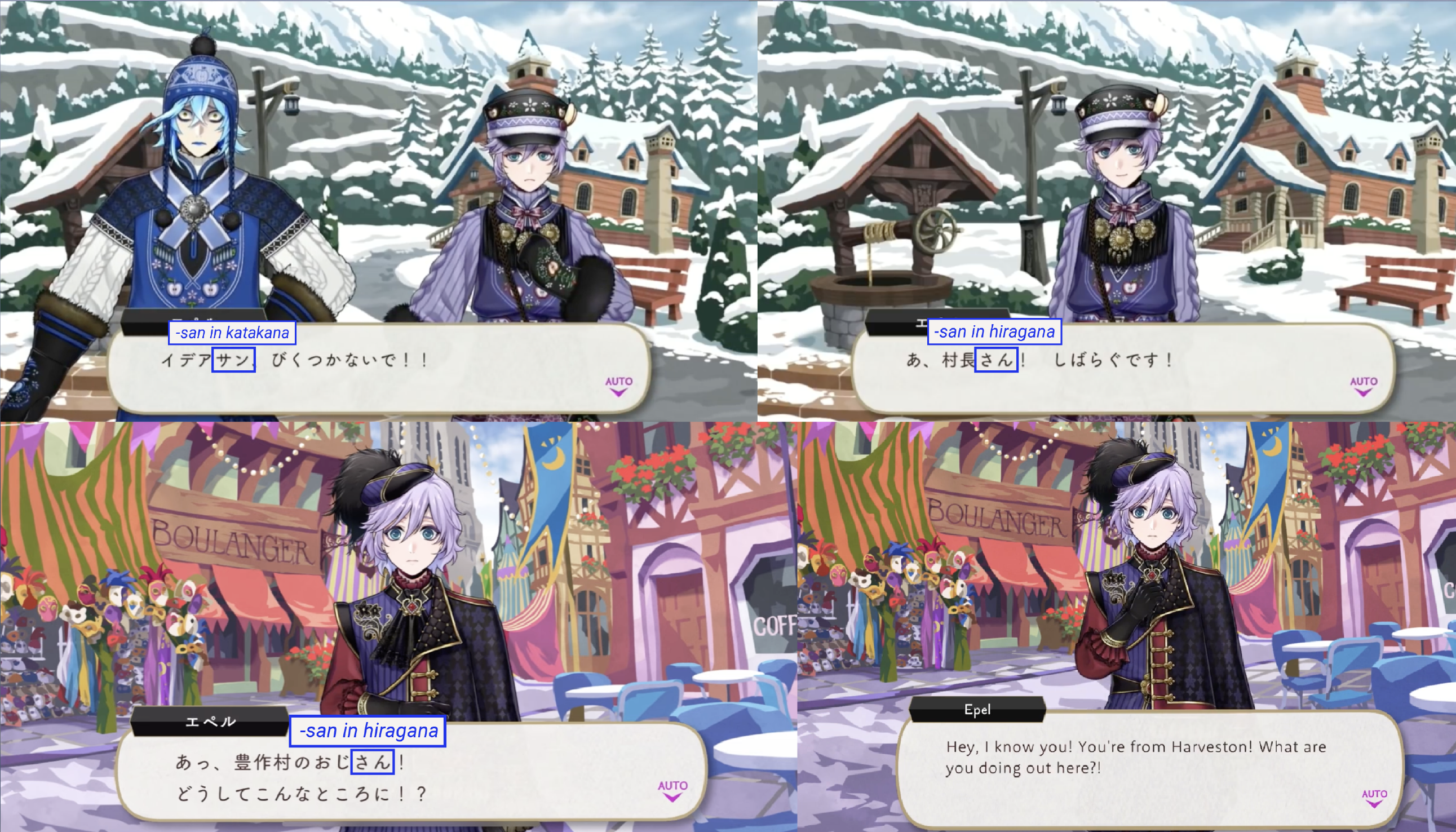 Bonus: Unlike other characters who use hiragana for honorifics, Epel uses katakana (the alphabet for foreign loan words) with his fellow students, but not with people from his village.