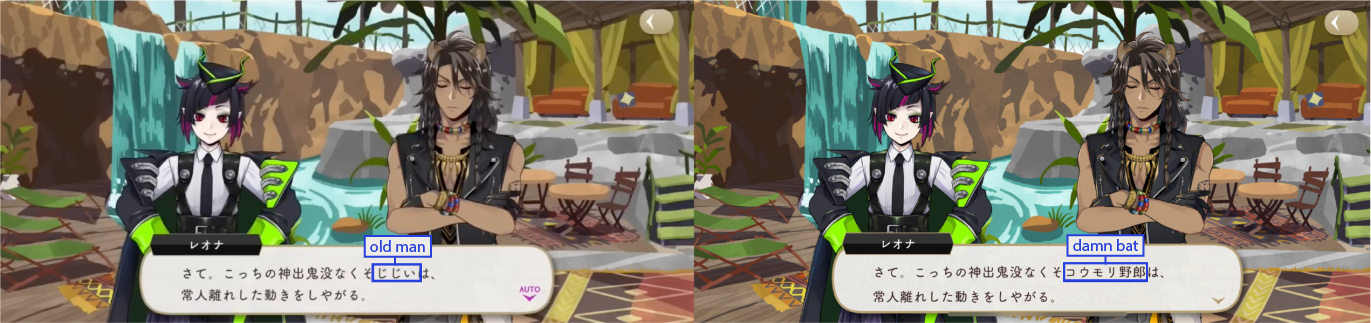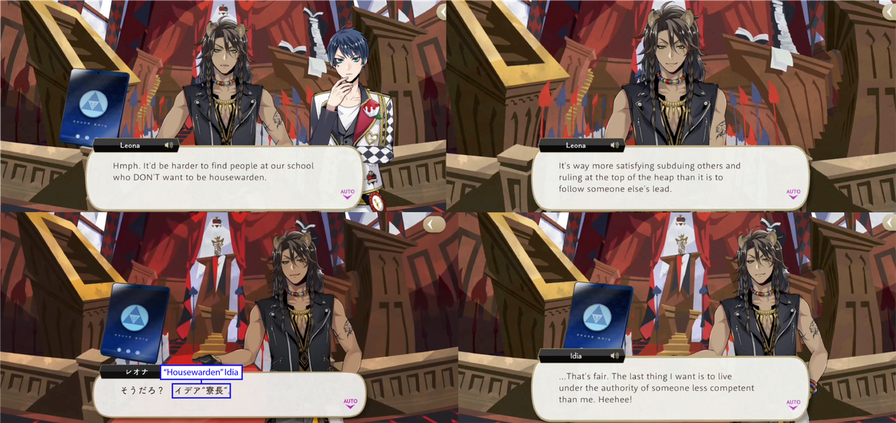 (Note: The original request for this series came from someone looking for references for a fanfic, and I am not certain if the Japanese-language names are preferred 100% of the time or if it is okay to integrate English when the meaning is not obvious, so things are a little mixed together. “Wani” is crocodile, while “yarou” is an impolite word. It technically means close to the English word “guy” in a literal way, but it is used to insult people. Leona uses it a lot, but as there is not really an English-language equivalent, I have left it just as “yarou” in these screenshots.)