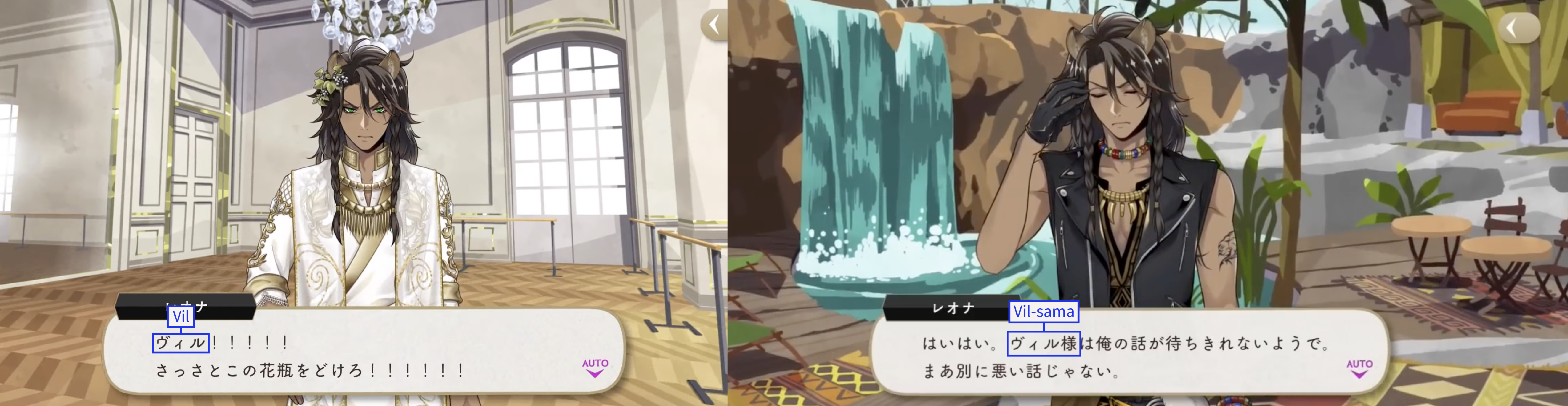 Leona also calls Vil by his name, calling him Vil-sama during an exasperating moment in an event. He calls Cater by his name.
