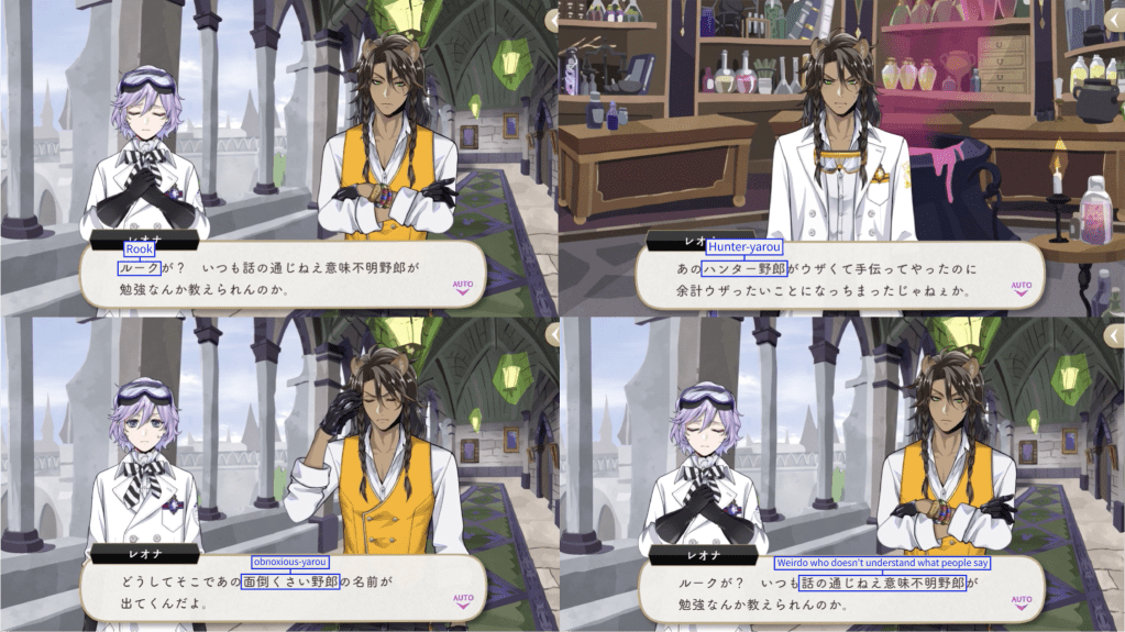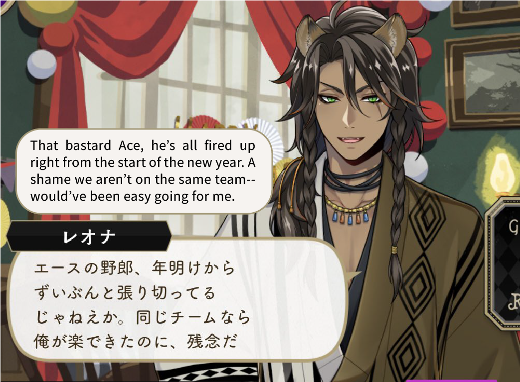 Leona insults Rook several times during a vignette, calling him by his name but also “hunter-yarou,” “mendokusai-yarou” (for something that is a hassle/obnoxious/troublesome) and “weirdo who doesn’t understand what people say.”