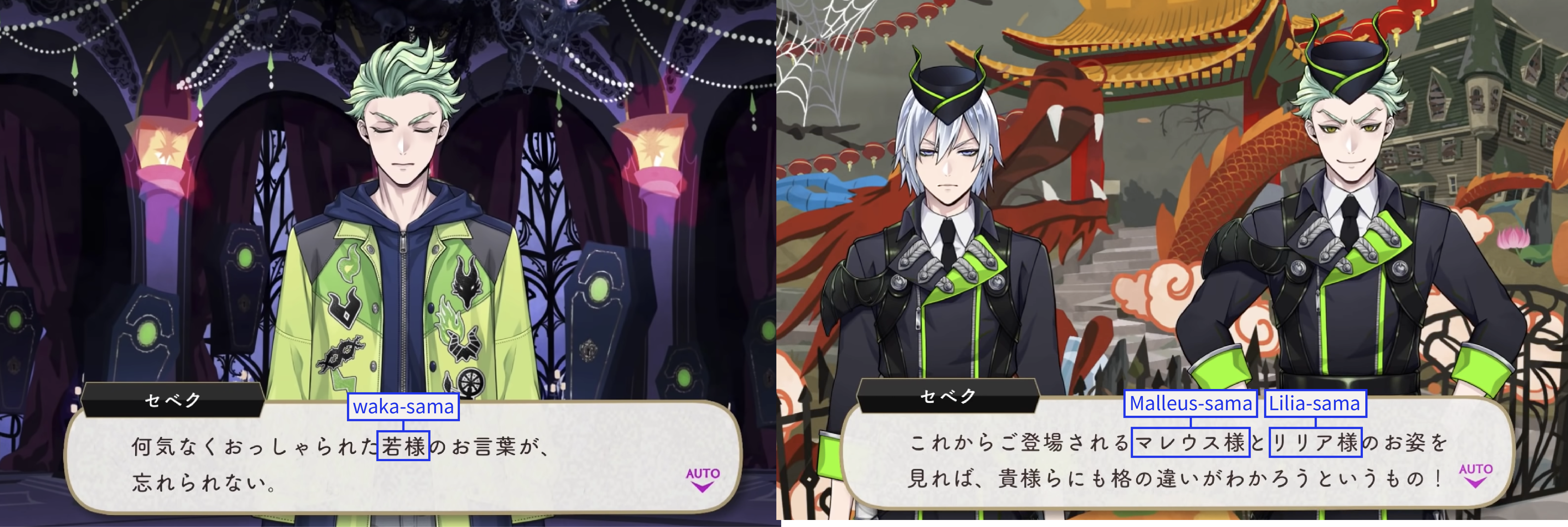Exceptions: Lilia is “Lilia-sama” and Malleus is either “Malleus-sama” or “waka-sama.”