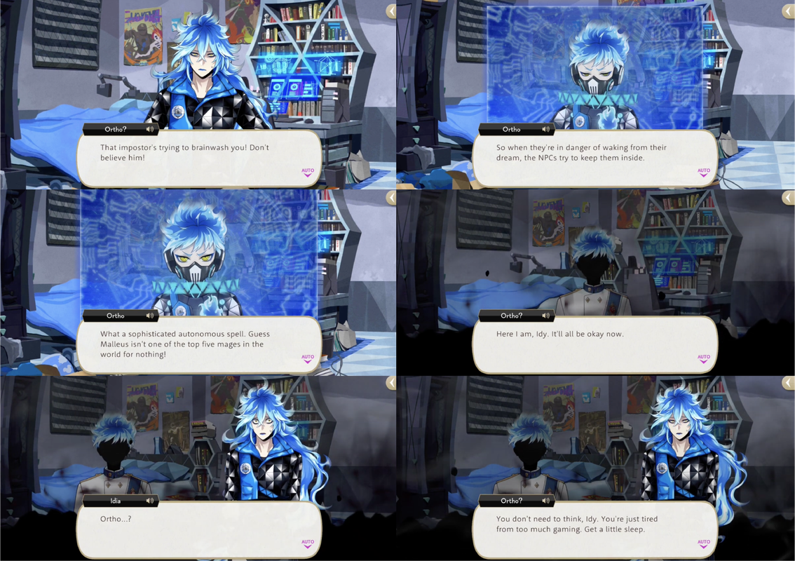Dream-Ortho calls him on his phone, claiming that the robot is an imposter, and appears in Idia’s room in an RSA uniform to drag Idia down into a deeper sleep.