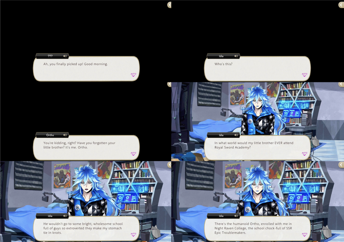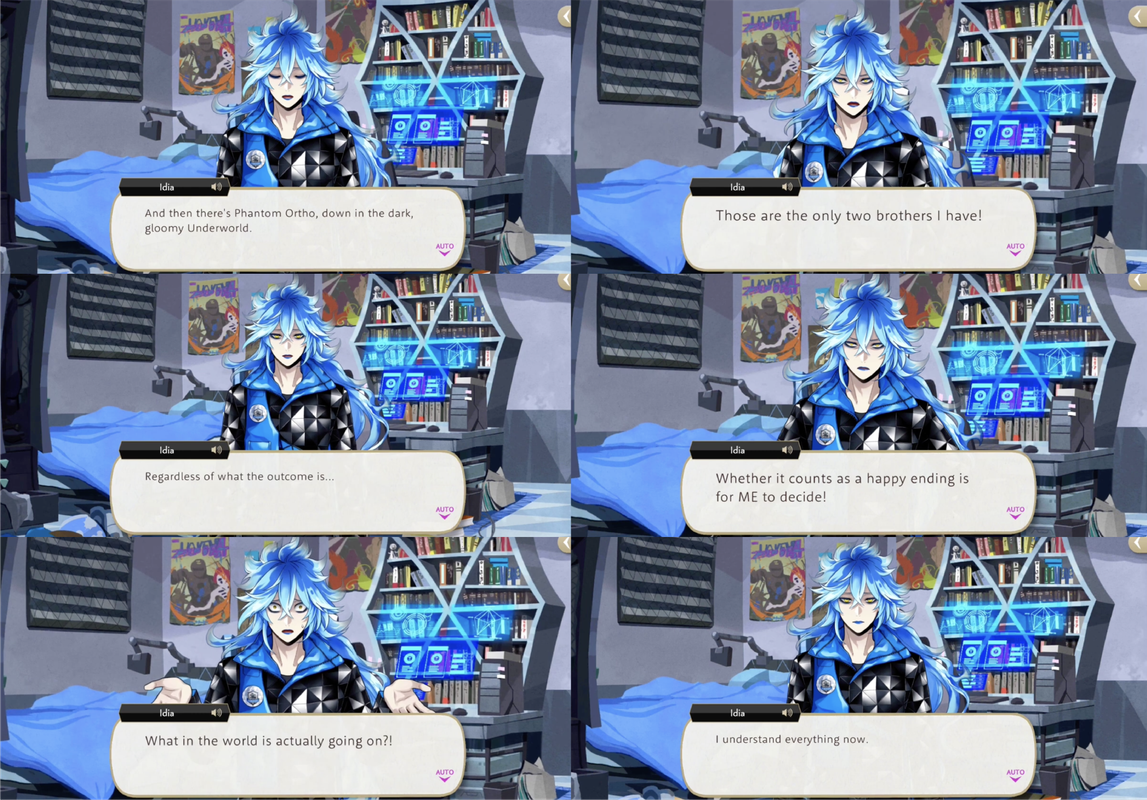 Idia says that his little brother would never attend a bright, wholesome school full of extroverts like RSA and his only little brothers are Robot- and Phantom-Ortho. Idia is not impressed with the dream that has been designed for him, saying that what counts as a happy ending is for himself to decide and hanging up on Dream-Ortho.