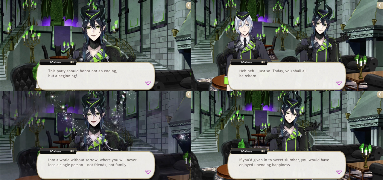 In reality, Idia became flustered when Malleus seemed to be mocking his anxiety and ran away to his dorm room, breaking a promise to robot-Ortho that they would attend the ceremony together, while Malleus forgot the ceremony entirely.
