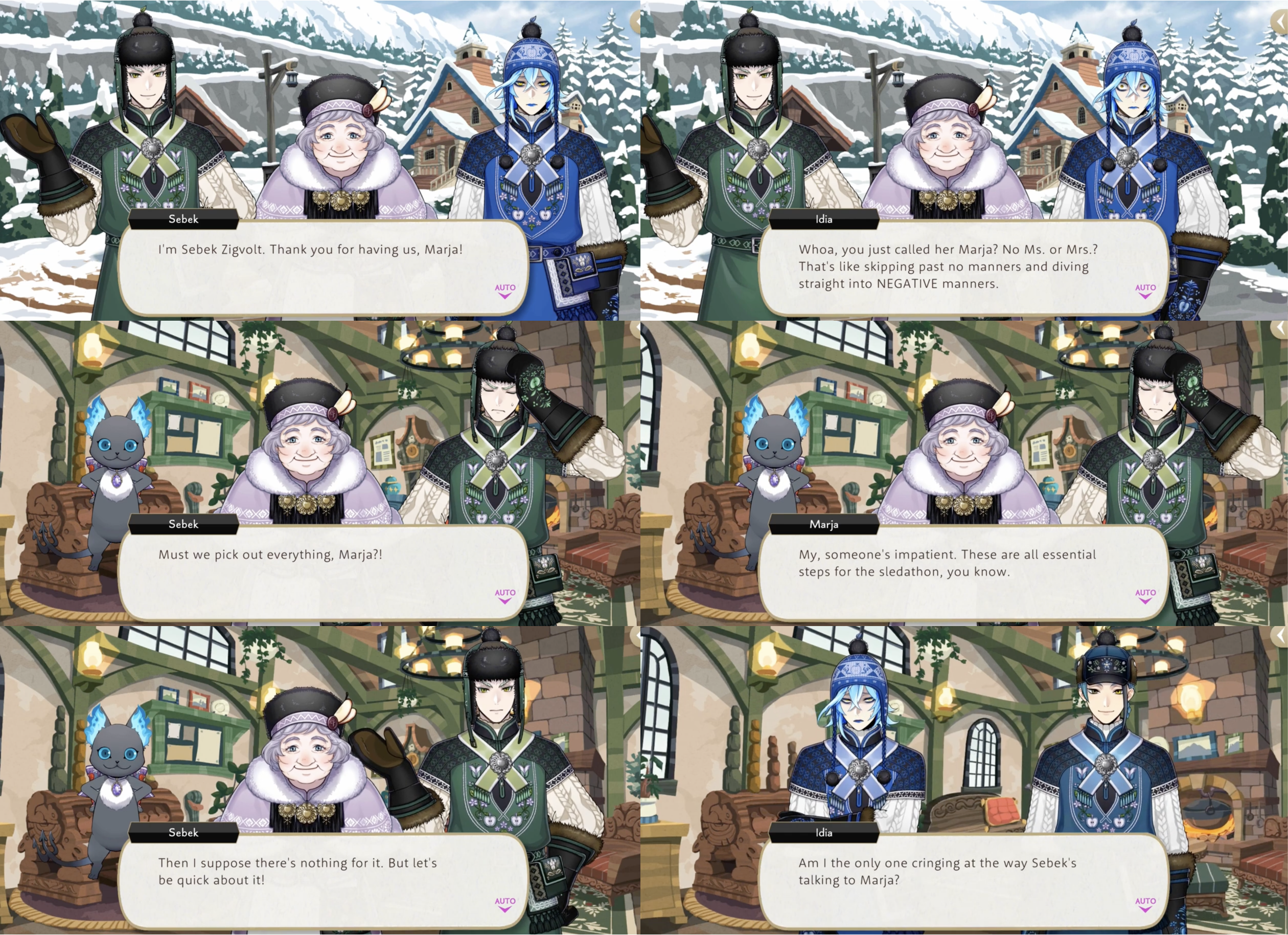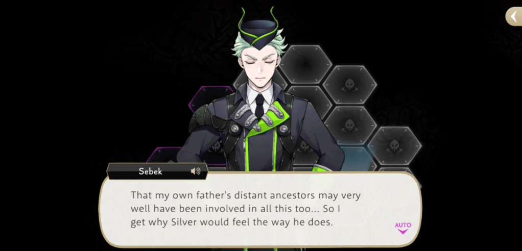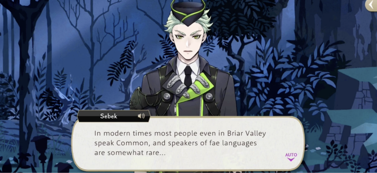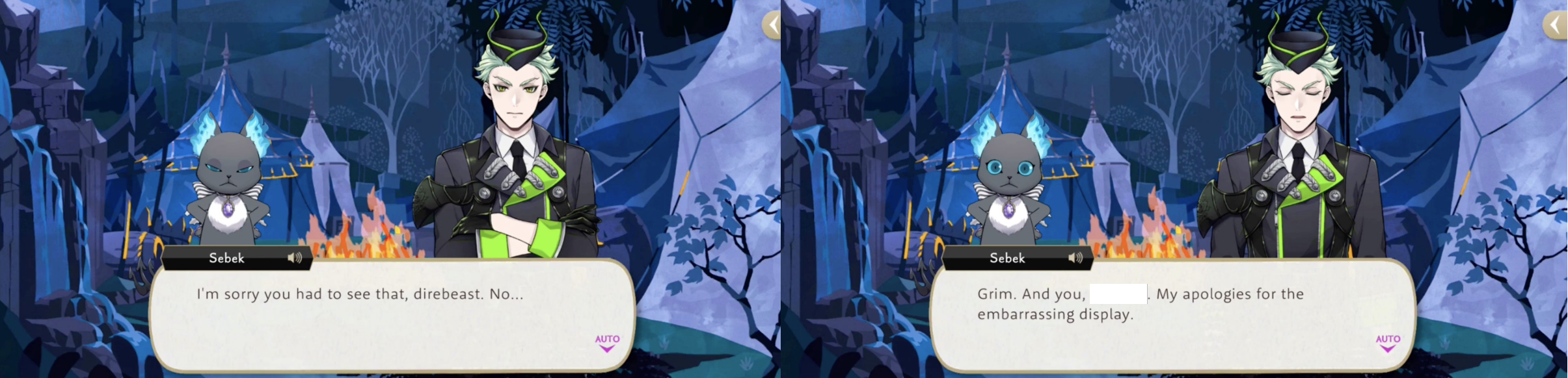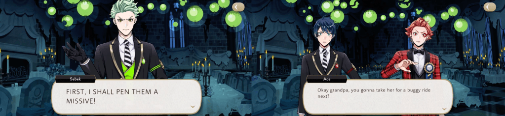 *Sebek refers to Sally as “Sally” throughout the Halloween event, using her name without an honorific but at least using it, much like he did with Marja. He also chastises Trey for failing to offer his hand to Sally and help her to her feet when she falls to the ground. Does Sebek possibly have a chivalrous side, not dissimilar to Leona? Memo: must check.