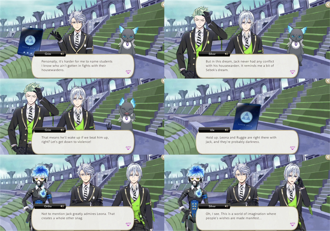 Grim suggests awaking Jack through violence but Idia cautions against it, as he is accompanied by dream-versions of Ruggie and Leona: as Jack greatly admires Leona and they are in a world where his wishes are being made manifest, it is likely that Jack’s admiration of Leona will make Leona even stronger in the dream than he is in reality.