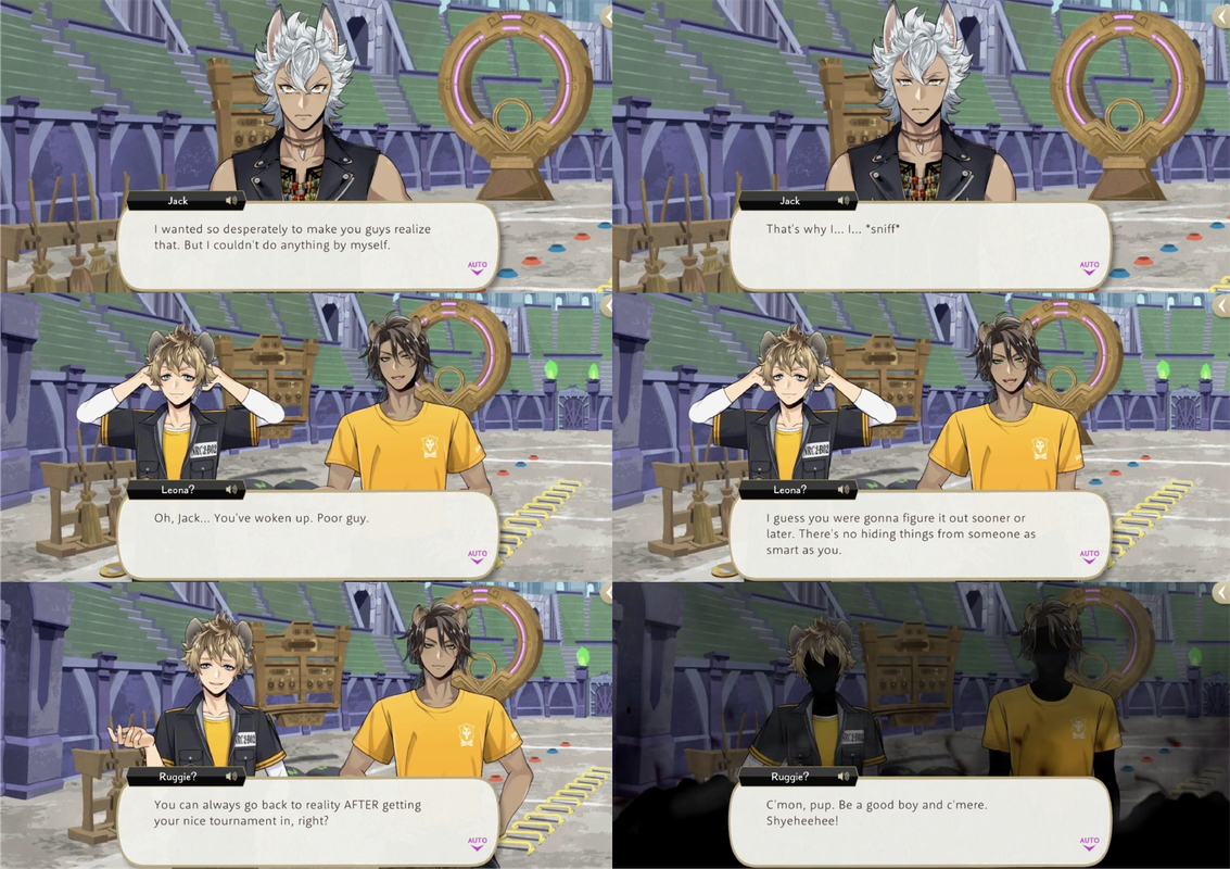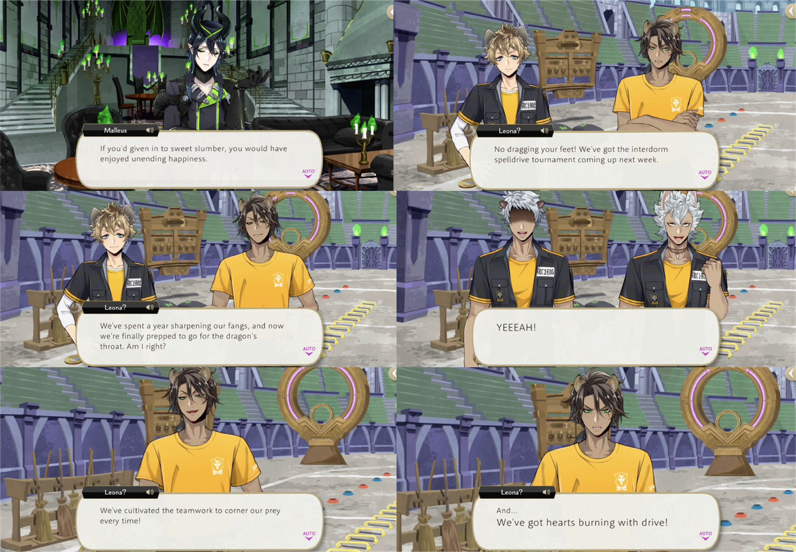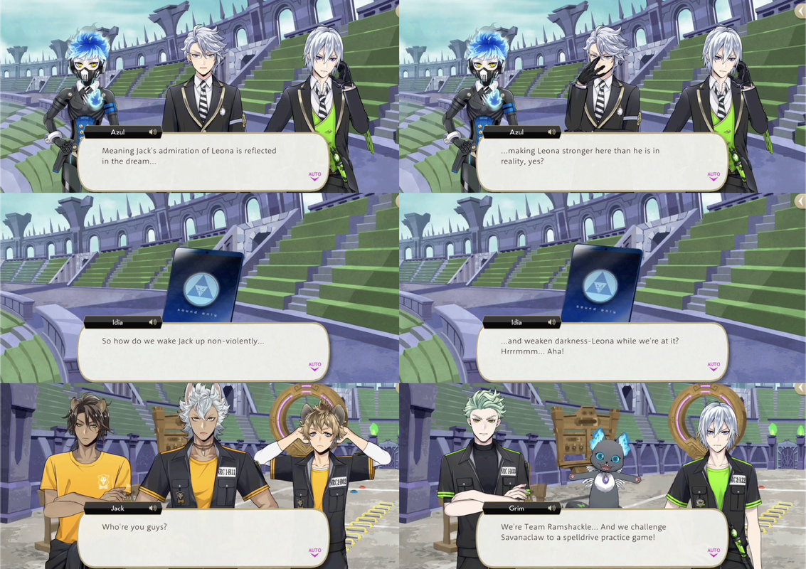 Dream-Leona and dream-Ruggie encourage Jack to stay asleep long enough to fulfill his dream of experiencing the interdorm spelldrive tournament, but Jack refuses, saying, “The upperclassmen I’ve got here would never pull any nasty tricks…but those upperclassmen don’t exist! The ones I looked up to, the ones I wanted to go all out…that wasn’t you guys! I don’t wanna fight alongside fakes. I’m gonna clear my own path!” and fighting the dark.