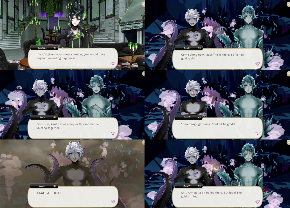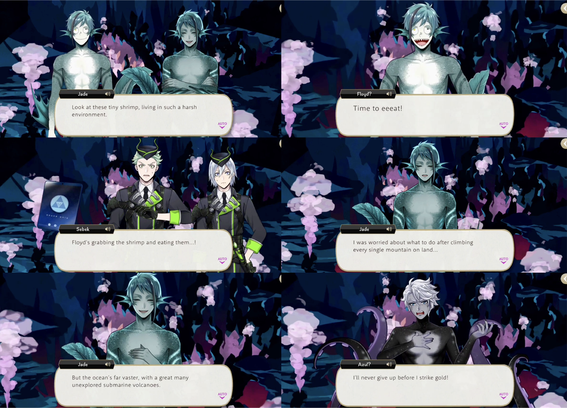 Malleus sends all of Sage’s Island to sleep in Book 7 so that they might enjoy “unending happiness,” and for Jade this seems to manifest as a dream world where he is visiting underwater volcanoes with Azul and Floyd, who are happily joining him in his hobby.