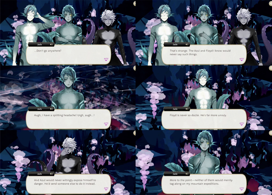 Jade observes that his dream had been rather nice, with Azul and Floyd joining him on treks through a multitude of mountains, but it was likely only a matter of time before he lost interest in a world where everything goes according to plan.