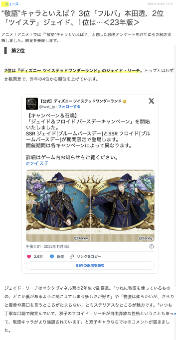 Jade is not the most polite person, oftening saying rude things, but the way he says them is always using polite speech, to the point that he was voted #1 in 2024 and #2 in both 2023 and 2025 on rankings of “What Character Comes to Mind When You Think of Keigo?” (voted #4 in 2022)
