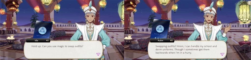 When asked if he can use magic to change his clothes Kalim explains, “I can handle my school and dorm uniforms. Though I sometimes get them backwards when I’m in a hurry.”