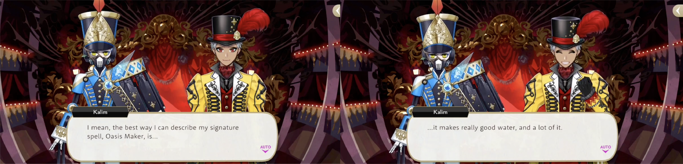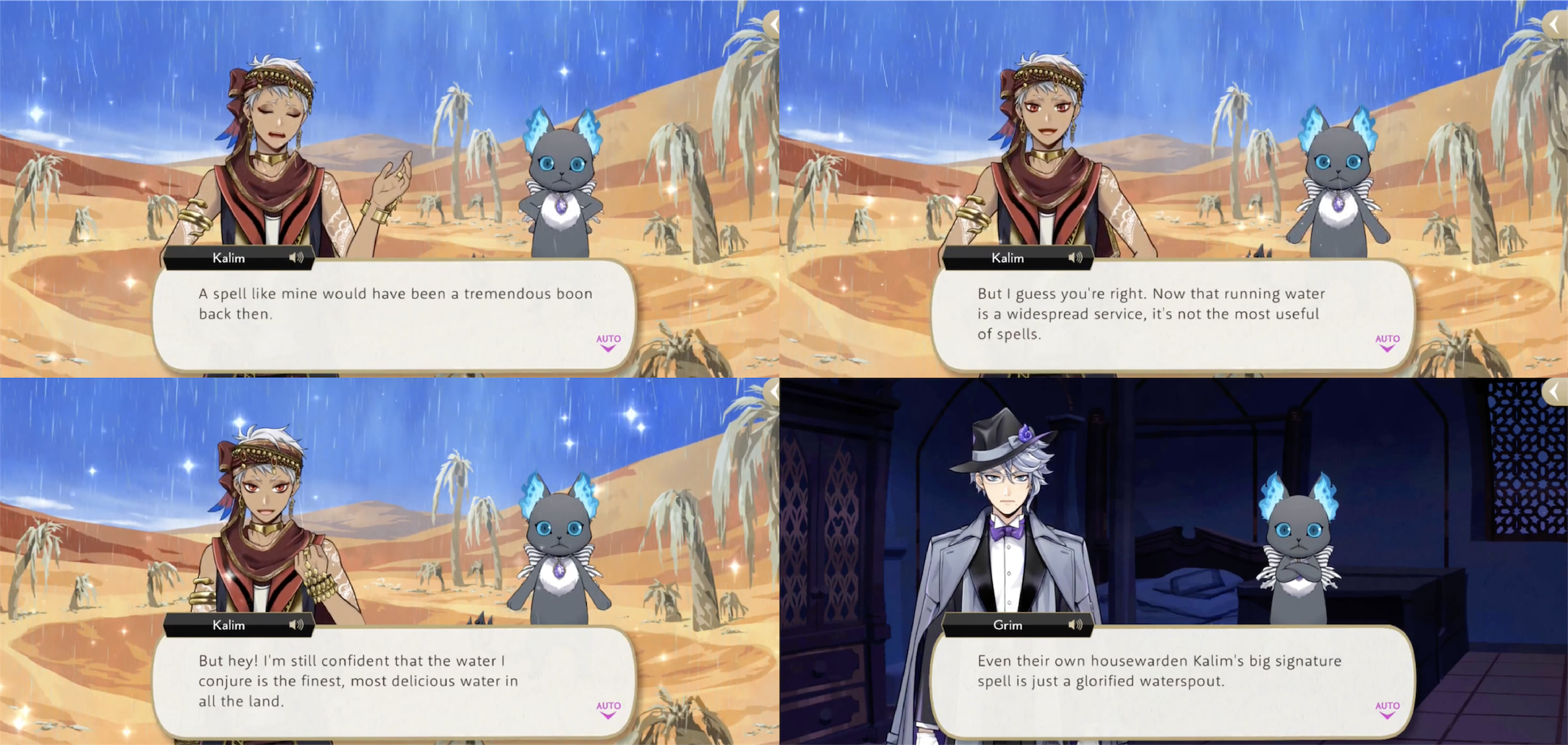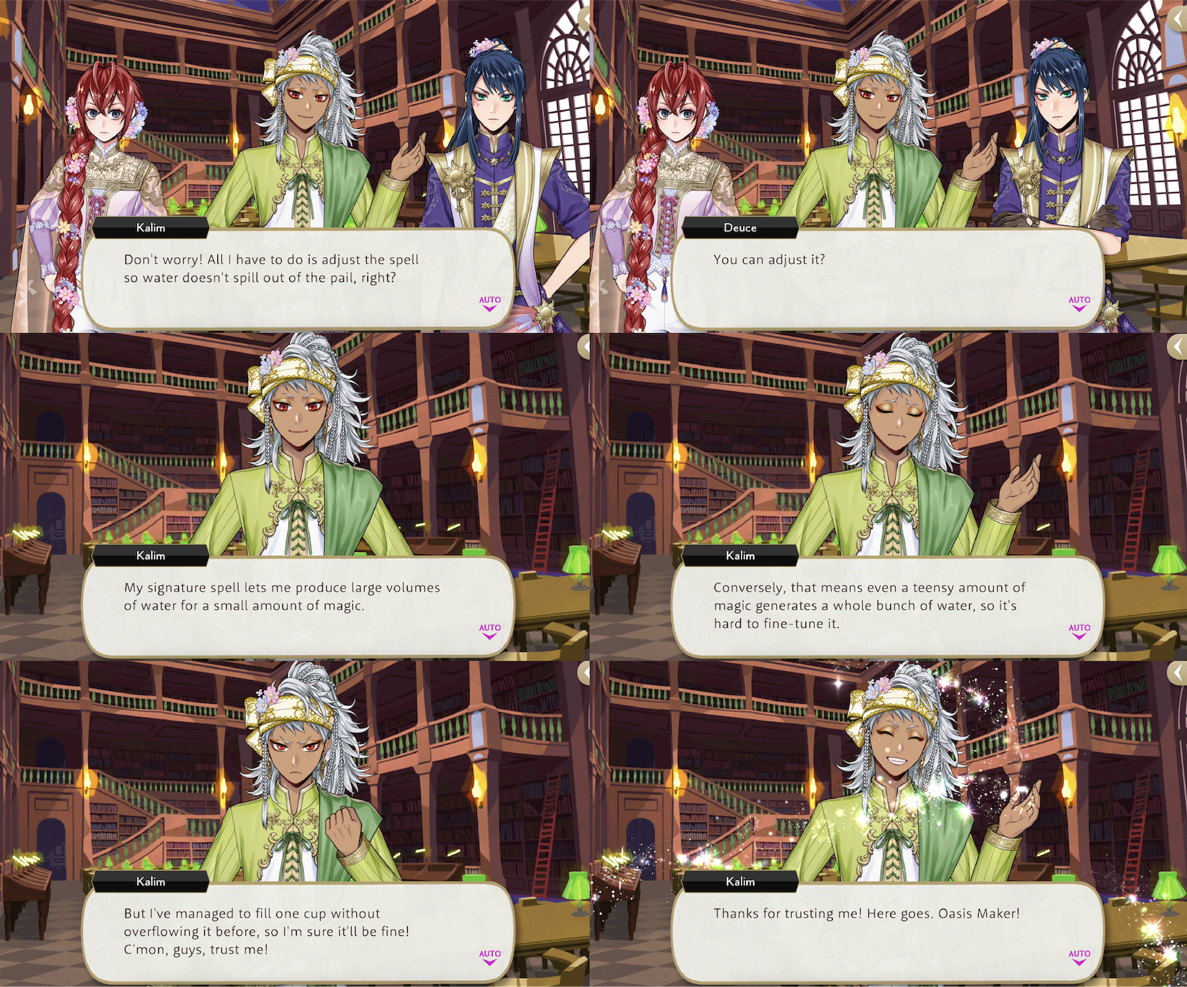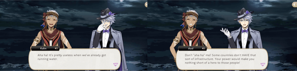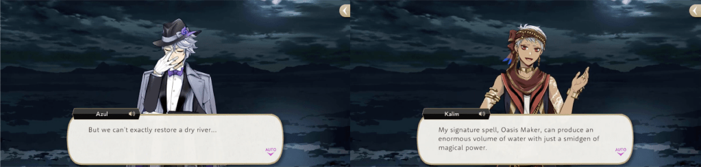 Kalim later downplays his unique magic to Azul, saying, “It’s pretty useless when we’ve already got running water,” but Azul disagrees: “Some countries don’t HAVE that sort of infrastructure. Your power would make you nothing short of a hero to those people!”