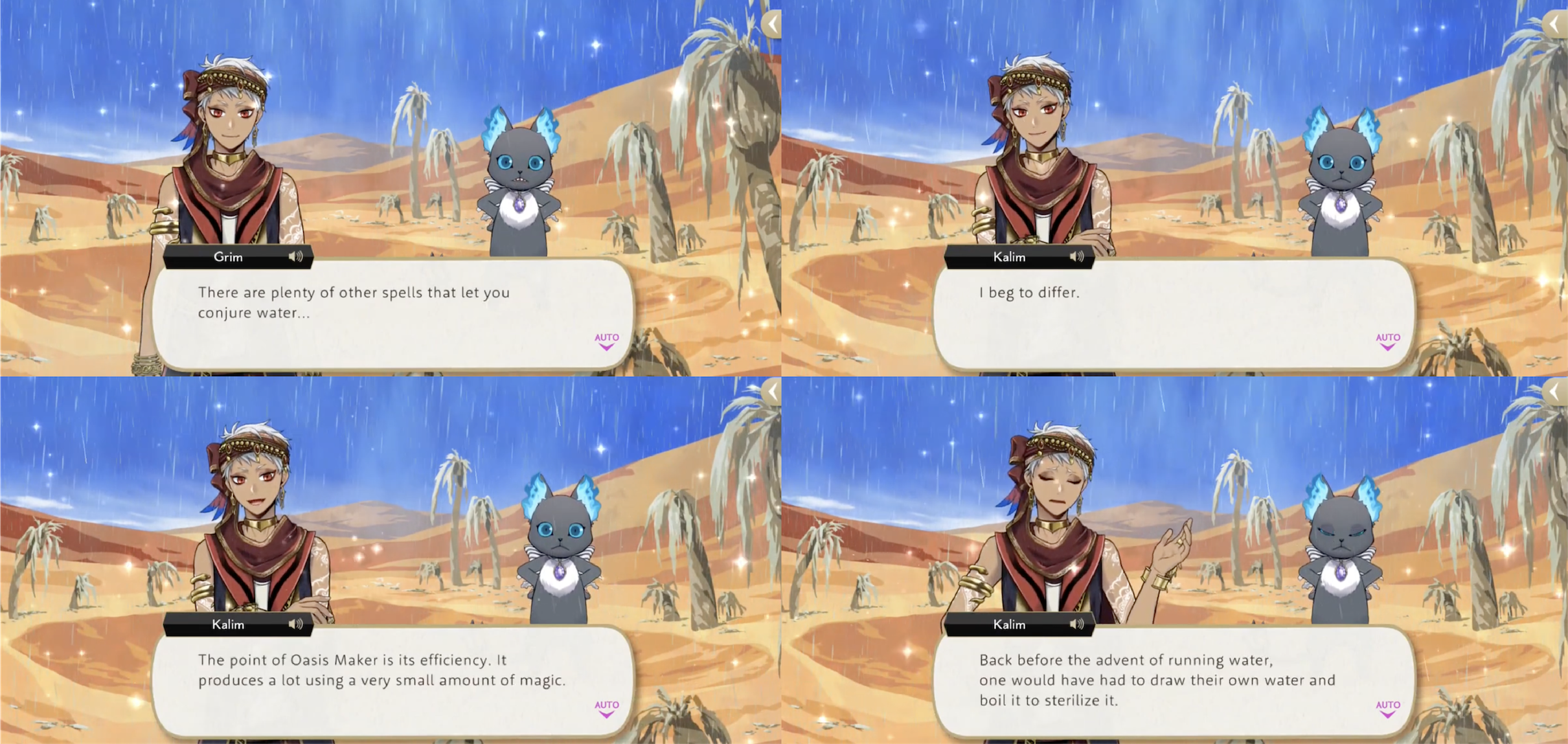 When Grim points out that “there are plenty of other spells that let you conjure water…” Kalim says, “The point of Oasis Maker is its efficiency. It produces a lot using a very small amount of magic. Back before the advent of running water, one would have had to draw their own water and boil it to sterilize it. A spell like mine would have been a tremendous boon back then.”