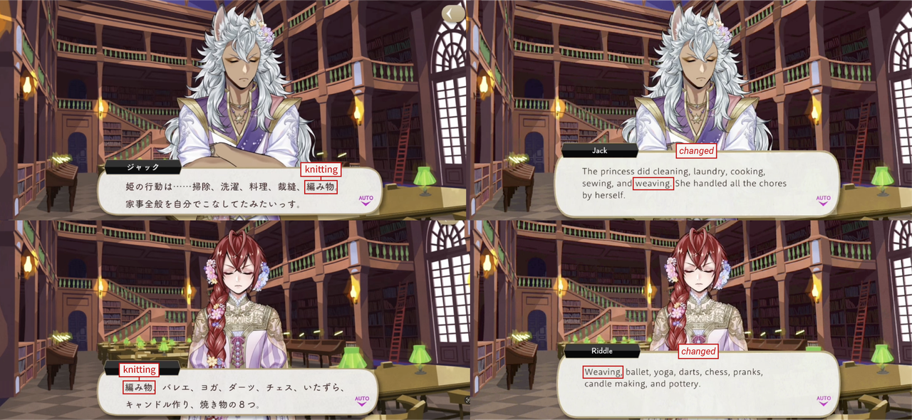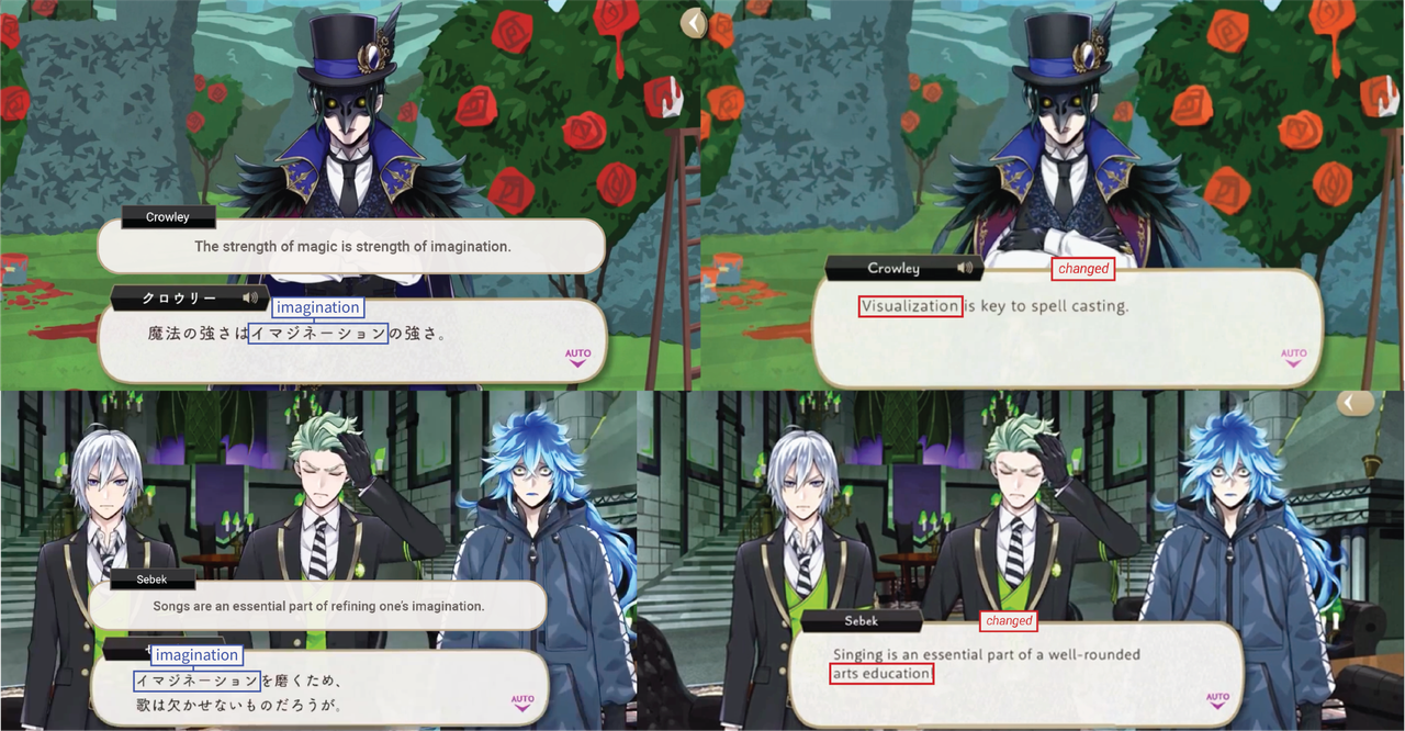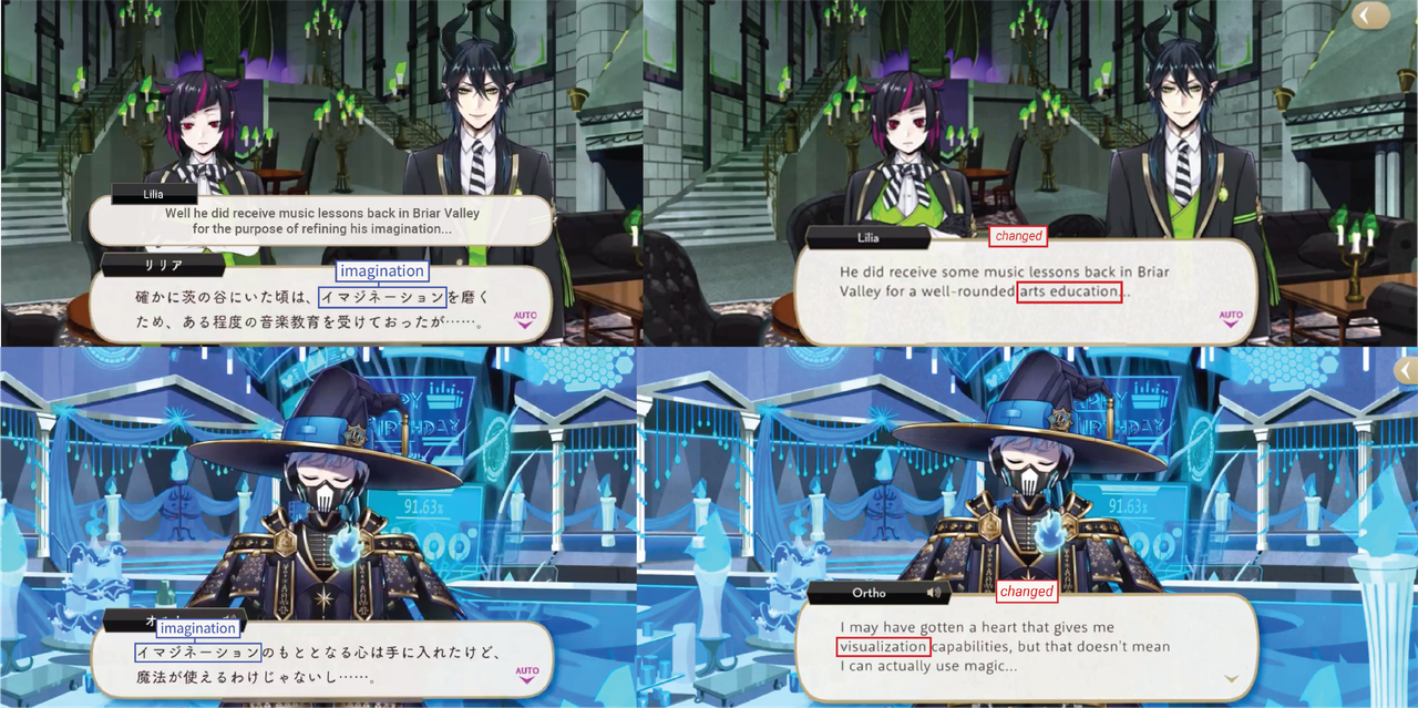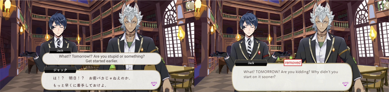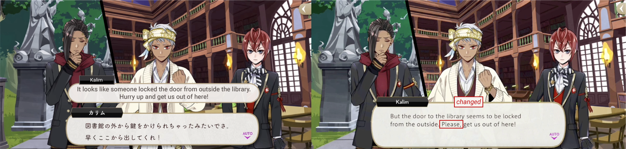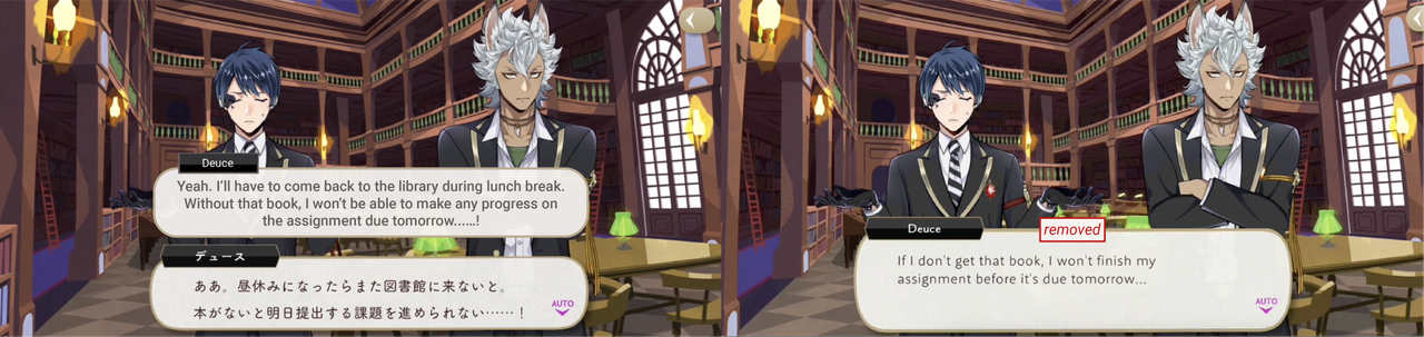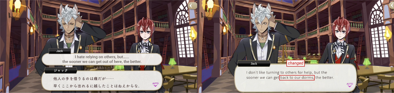 These kinds of changes can run the risk of mischaracterizing characters like Jack and Kalim in subtle ways: Jack sounds less abrasive than he is in the original game, and Kalim sounds more polite than he really is. These changes maybe help English-language text flow more smoothly, but they maybe also affect how different players are perceiving the same characters.