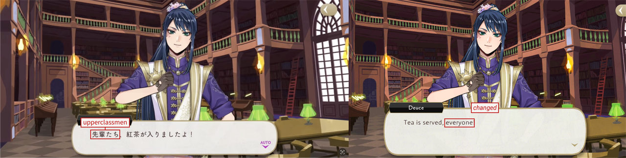 In the original game Deuce announces that tea has been prepared for the upperclassmen (Kalim and Riddle), changed on EN to announcing that tea is ready for everyone.