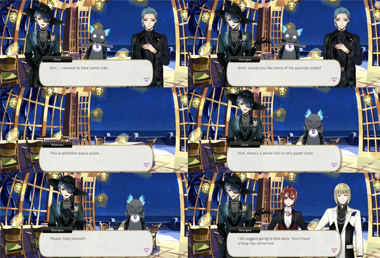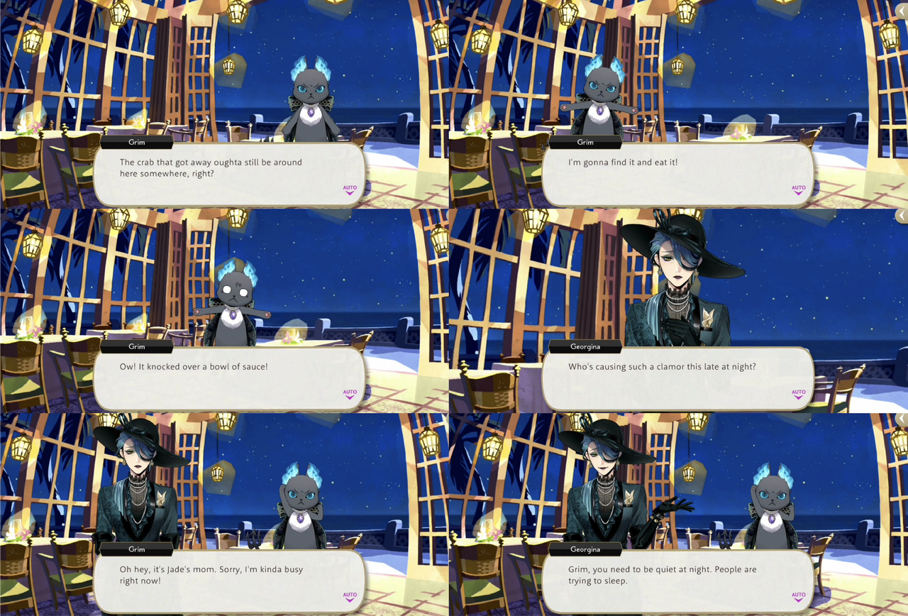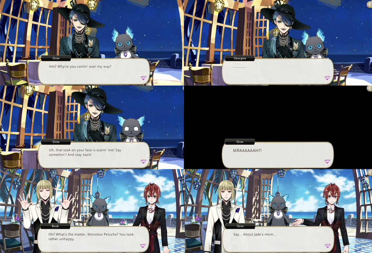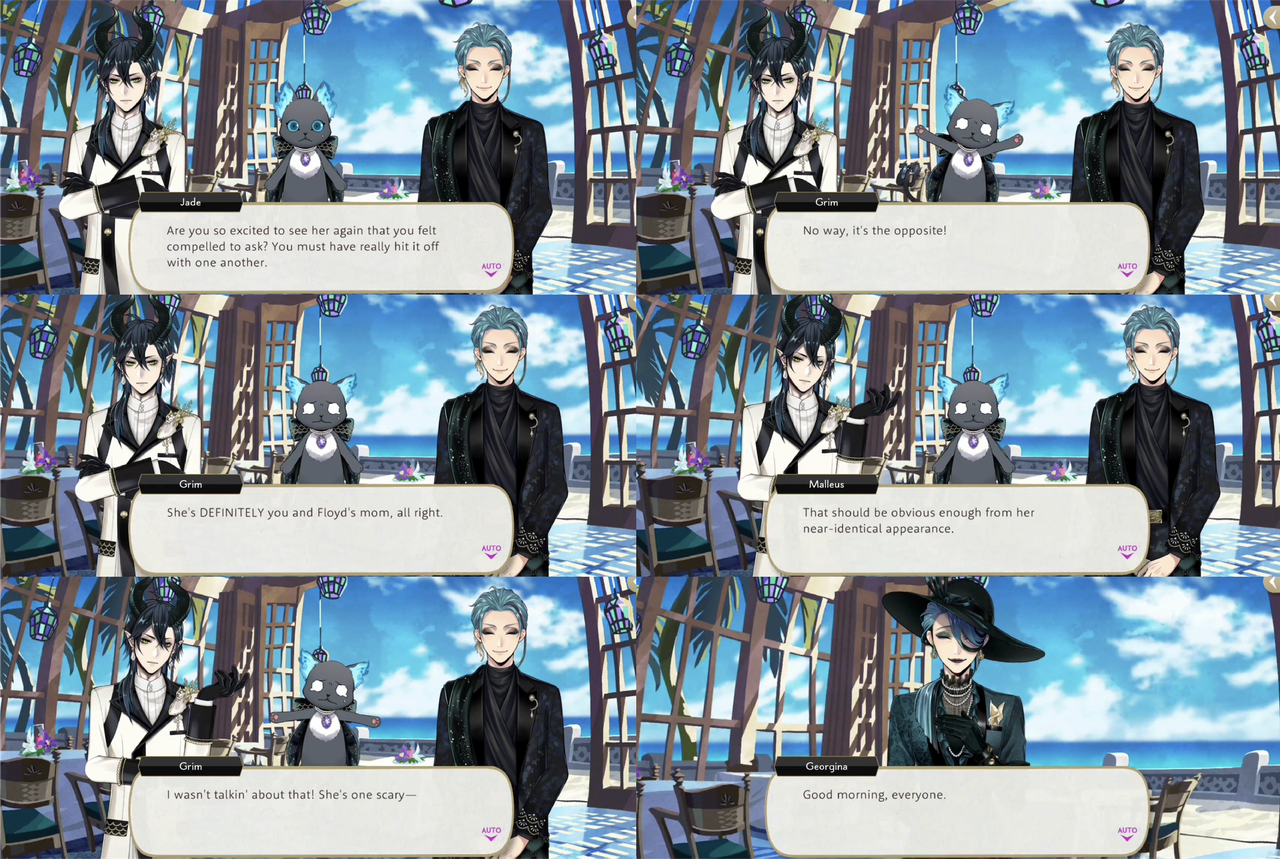 The following morning Rook comments Grim looks “rather unhappy,” and Jade asks if Grim is excited to see his mother again. Grim says “it’s the opposite,” and, “She’s DEFINITELY you and Floyd’s mom, all right,” but does not elaborate beyond, “She’s one scary—,” at which point he is interrupted by Georgina herself.