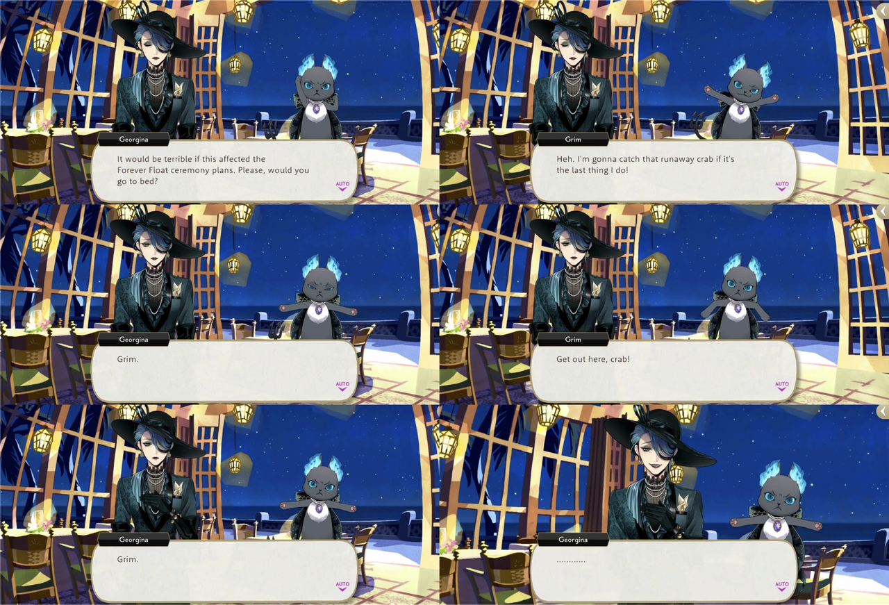 After the students go to bed Grim seems to stay behind in the restaurant in order to hunt down his runaway crab, knocking over a bowl of sauce in the process. Georgina tries to send him to bed so that he does not keep people up when they are trying to sleep, which might affect the Eternity Float trials, but Grim refuses.
