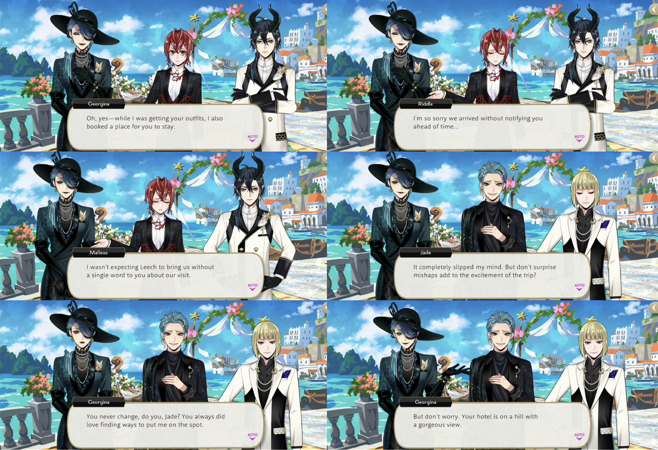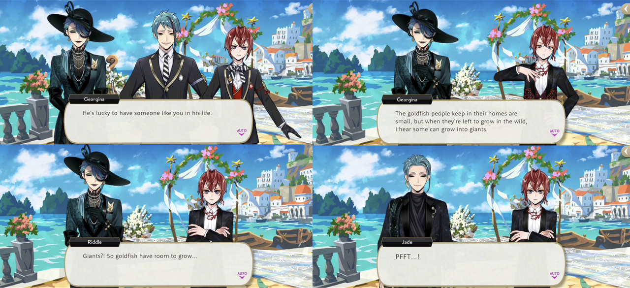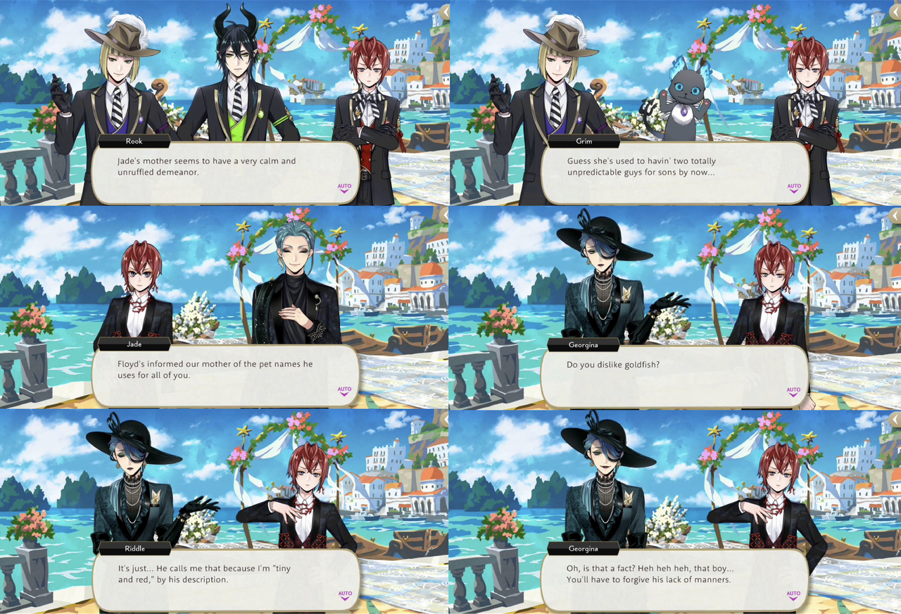 Riddle apologizes for arriving unannounced, with Malleus explaining that he hadn’t expected Jade to bring them along without first telling Georgina that they were coming, which gave her no opportunity to prepare.Jade says hat doing so “completely slipped ‘(his) mind. But don’t surprise mishaps add to the excitement of the trip?”