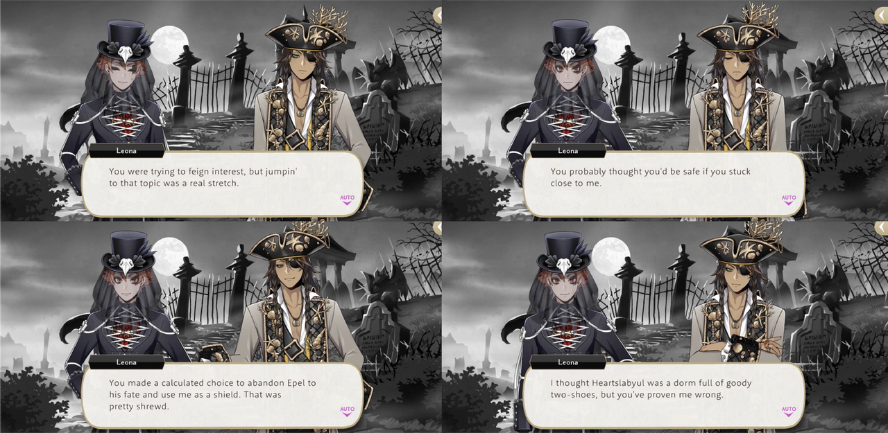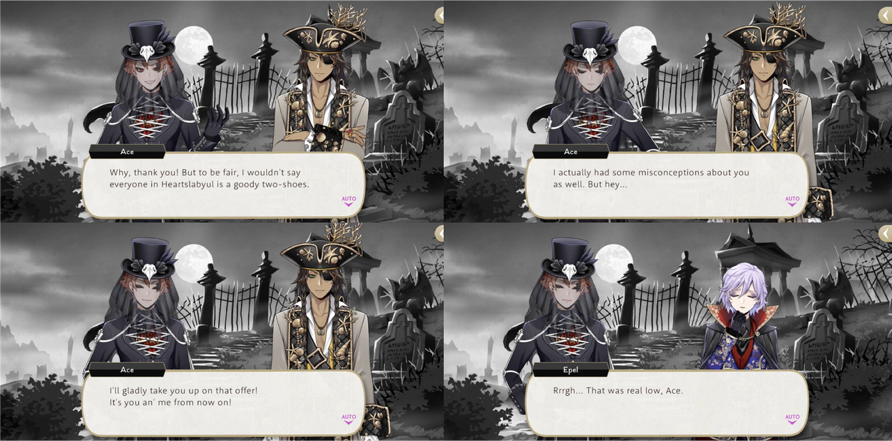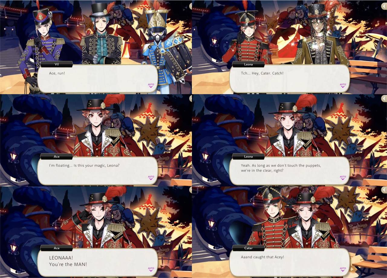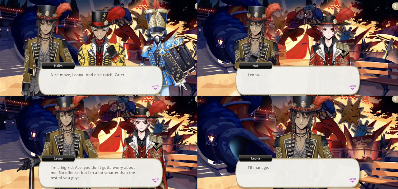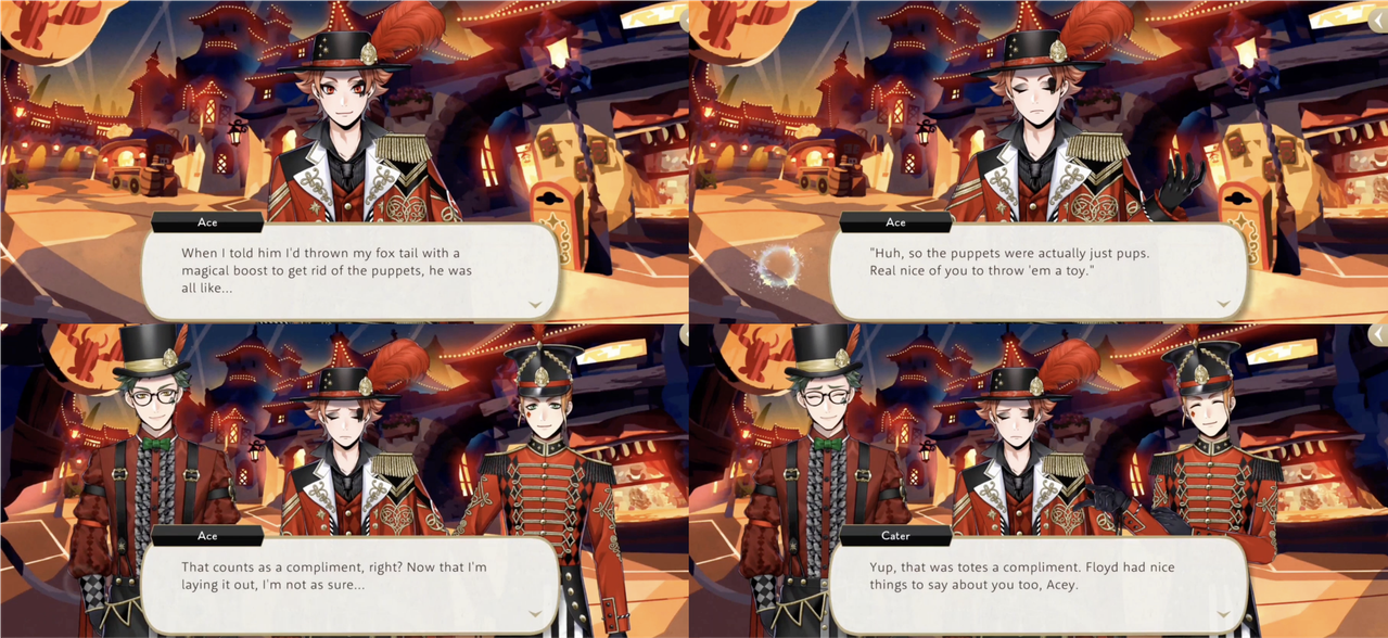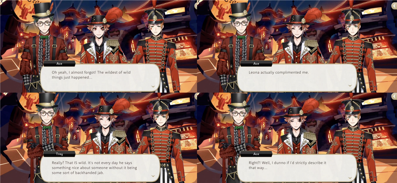 At the end of the event Ace says, “Leona actually complimented me,” sharing with Trey and Cater that Leona told him, “Huh, so the puppets were actually just pups. Real nice of you to throw ’em a toy,” after Ace told him about how he’d gotten rid of the puppets in the theater. (“That counts as a compliment, right?”)