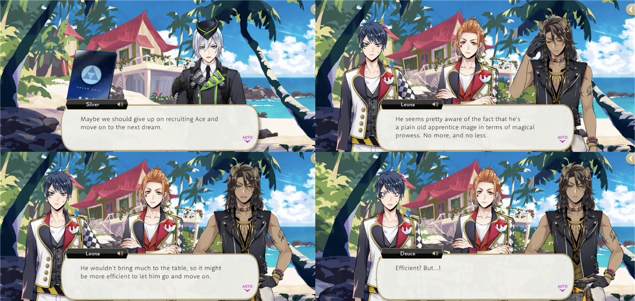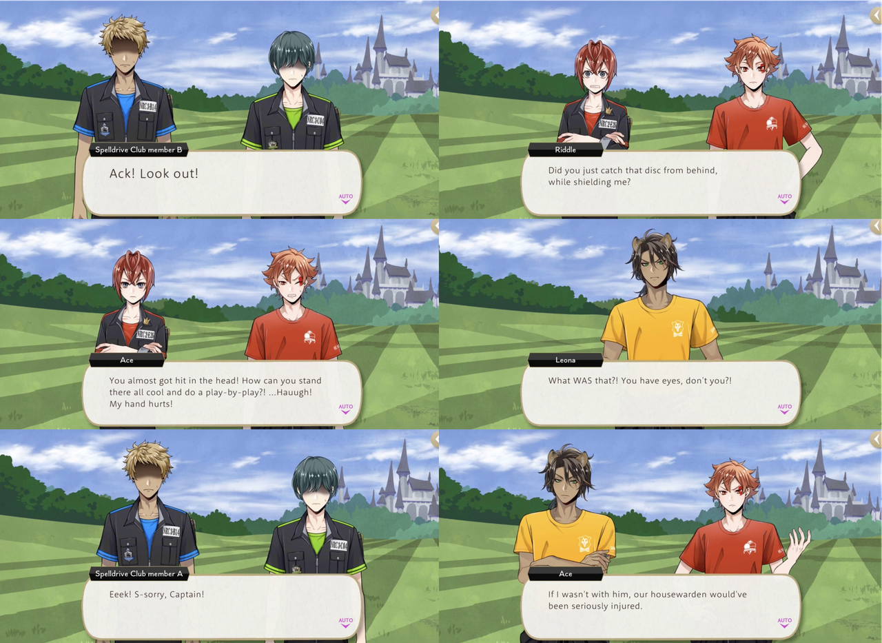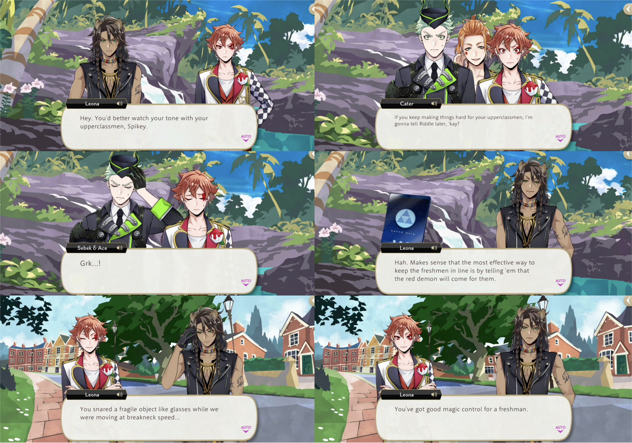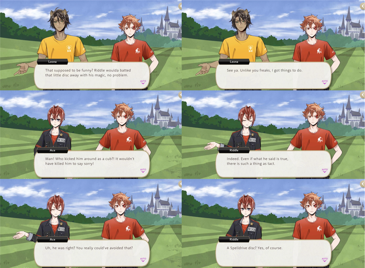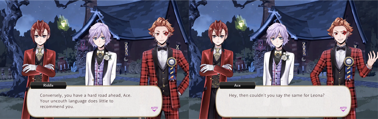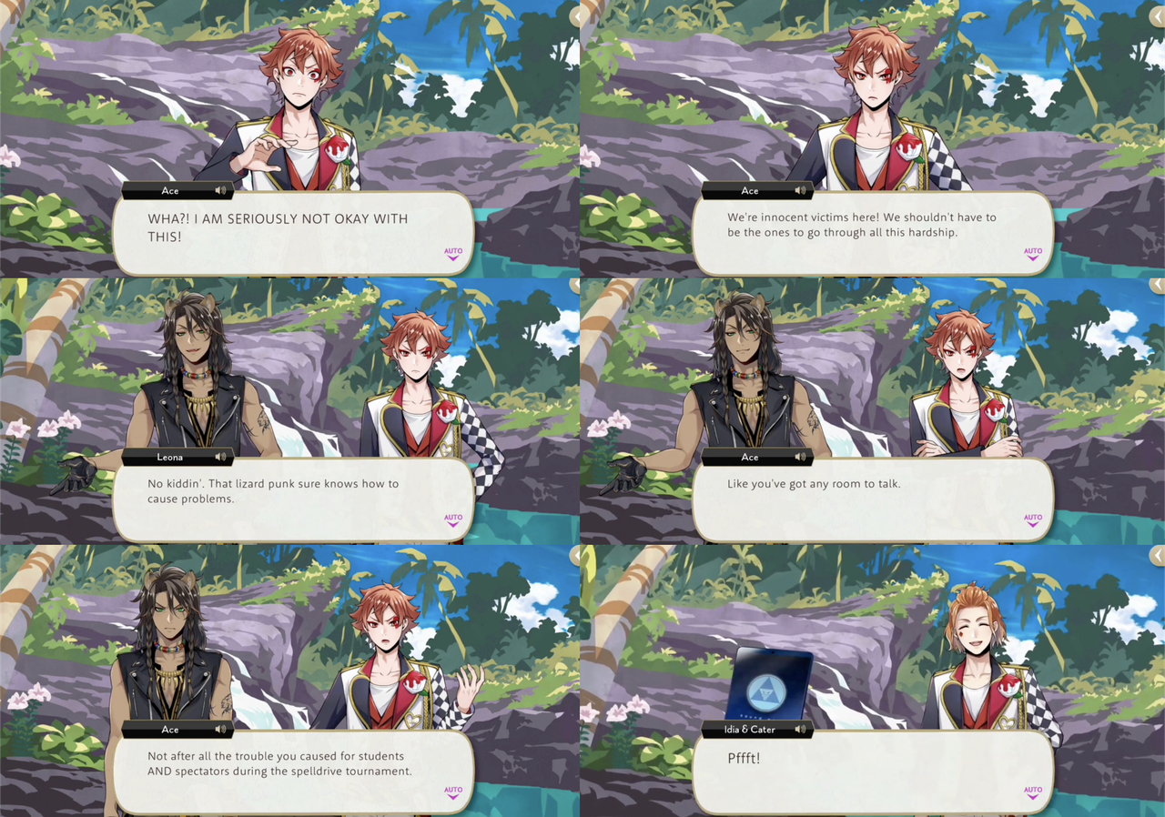 Ace does not seem to have the best opinion of Leona, accusing him of endangering Riddle with a spelldrive disc in an early vignette (“Who kicked him around as a cub?! It wouldn’t have killed him to say sorry!”), though Riddle reveals he was never at risk, which Leona knew.